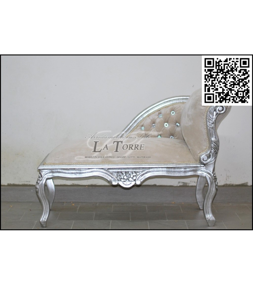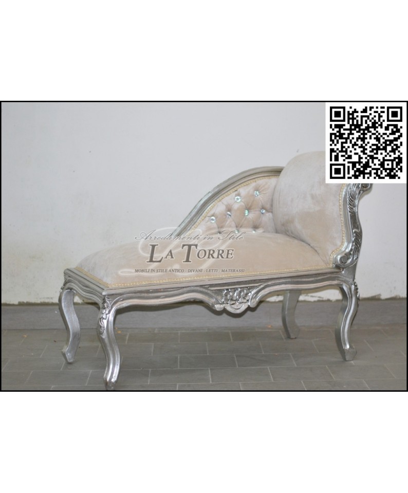 Dormeuse panca romana divano panchetta , sontuosa chaise longue in stile Luigi XV/Rococò, con struttura in legno in foglia argento. La seduta e lo schienale sono imbottiti in vellutino cipria e la testata ricurva sono impreziositi da una lavorazione capitonné, con bottoni in swarovski , che aggiungono brillantezza e un tocco glamour.