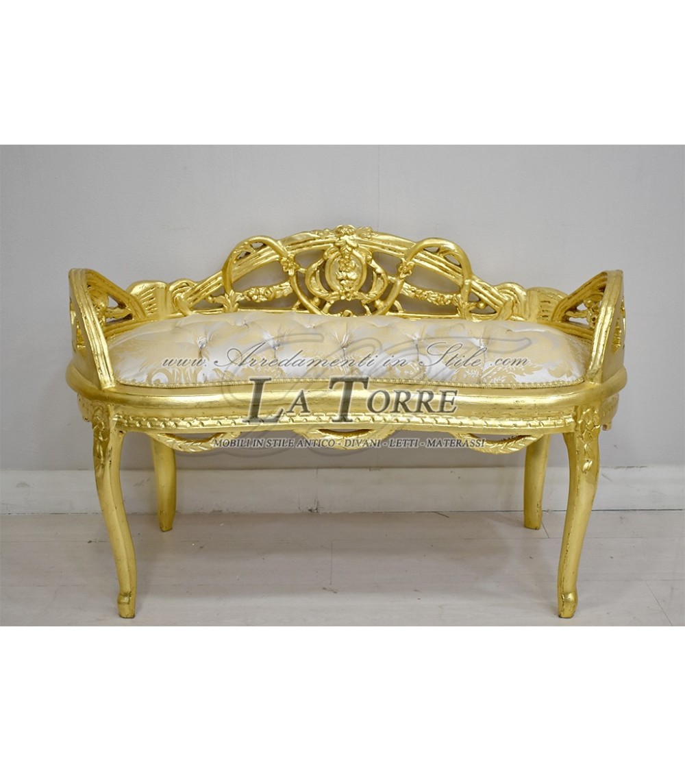 Dormeuse panca in stile Luigi XV, con struttura interamente realizzata in legno, rivestita da una brillante doratura che ne esalta ogni curva e dettaglio. Lo schienale e i braccioli presentano una profusione di intagli elaborati conchiglia e foglie d'acanto, creando una silhouette regale e ariosa. Lo schienale in particolare ha un design a "galleria" traforata, con un'importante decorazione centrale. La seduta è imbottita e rivestita in un tessuto damascato avorio, con una trama floreale tono su tono. La superficie della seduta è impreziosita da una lavorazione capitonné, che aggiunge profondità e un classico tocco di eleganza.