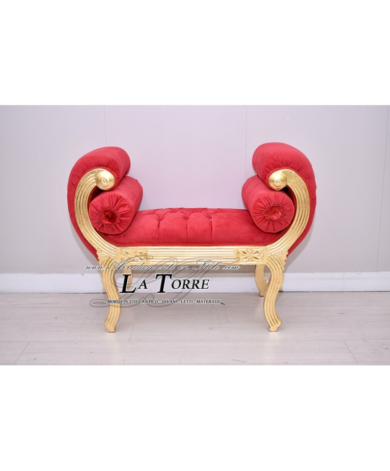 Dormeuse divano panca cinese in stile Luigi XV o Rococò, che si distingue per la sua opulenta finitura dorata e il design ricco di dettagli. La struttura è interamente realizzata in legno, la fascia perimetrale sotto la seduta è riccamente intagliata con motivi a ricciolo e floreali, aggiungendo un tocco di preziosità. Le gambe, elegantemente curve nello stile "cabriole", sono anch'esse dorate e intagliate. La seduta rivestita in velluto rosso, impreziosita da una lavorazione capitonné, che aggiunge profondità e un classico tocco di eleganza. Ai lati, la panca è dotata di due cuscini cilindrici (a rullo) che fungono da braccioli, rivestiti nello stesso tessuto con dettagli dorati alle estremità, che richiamano lo stile classico.