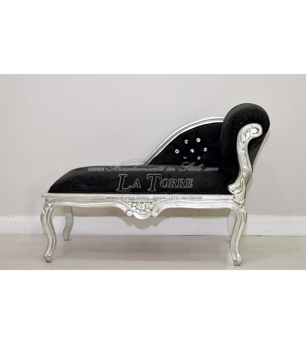 Dormeuse panca romana divano panchetta , sontuosa chaise longue in stile Luigi XV/Rococò, con struttura in legno in foglia argento. La seduta e lo schienale sono imbottiti in vellutino nero e la testata ricurva sono impreziositi da una lavorazione capitonné, con bottoni in swarovski , che aggiungono brillantezza e un tocco glamour.