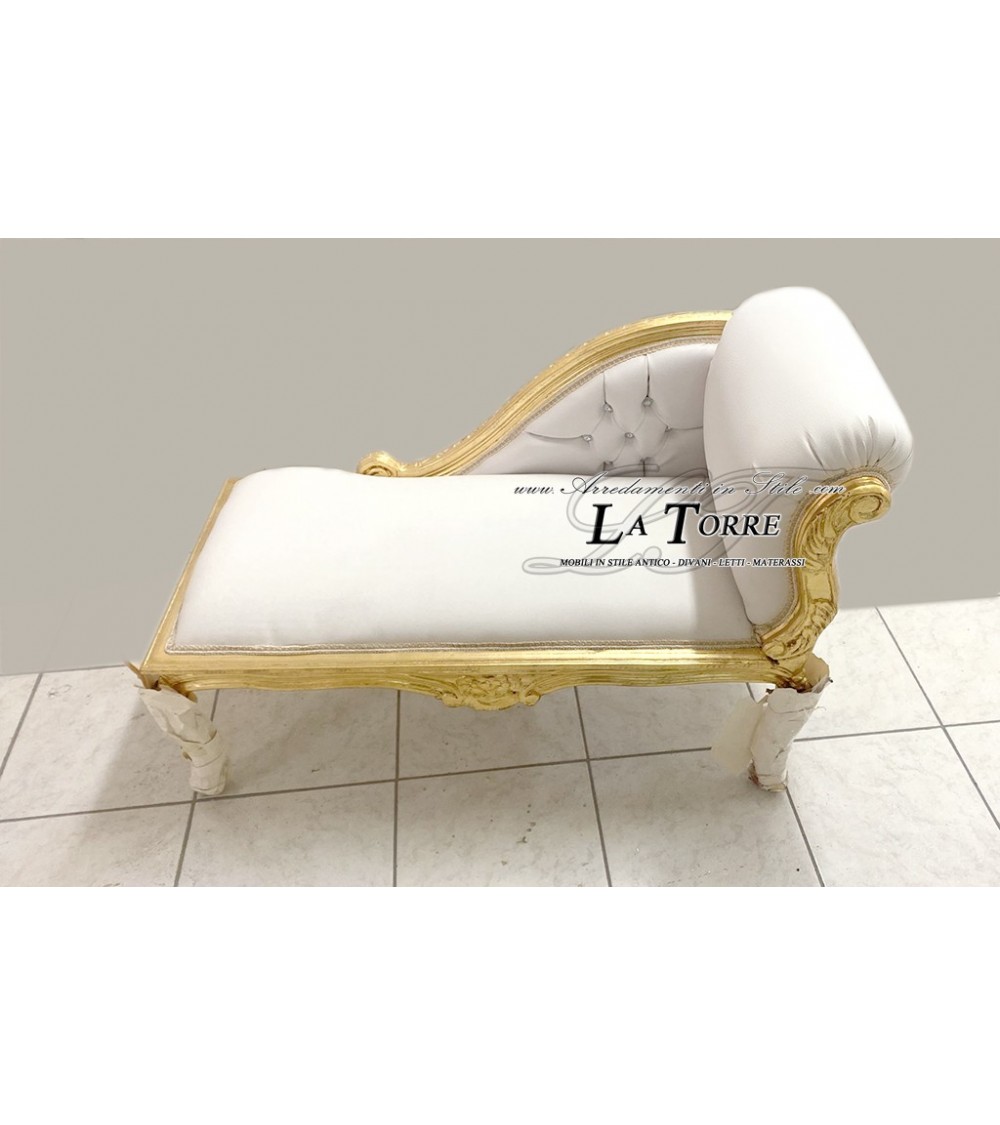 Dormeuse panca romana divano panchetta , sontuosa chaise longue in stile Luigi XV/Rococò, con struttura in legno in foglia oro. La seduta e lo schienale sono imbottiti in ecopelle bianca e la testata ricurva sono impreziositi da una lavorazione capitonné, con bottoni in swarovski , che aggiungono brillantezza e un tocco glamour.