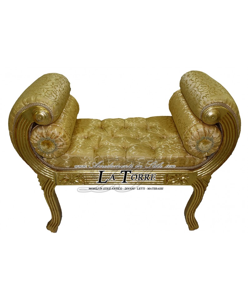 Panca rettangolare barocco , con una struttura interamente in foglia argento e riccamente intagliata. La seduta è imbottita in ecopelle bianca ,con bottoni rivestiti nello stesso tessuto che creano un motivo trapuntato, aggiungendo profondità e un classico tocco di eleganza rifinita con un cordoncino argentato. Le gambe sono curve e intagliate. Ideale per aggiungere un tocco di lusso e raffinatezza a un salotto formale, una camera da letto padronale, un ingresso o un ambiente di lusso, fungendo sia da comoda seduta che da elemento decorativo di grande impatto.