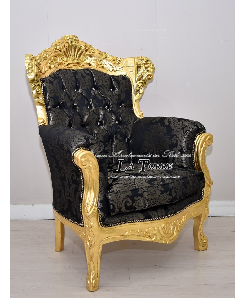 Divano Poltrona Germany Barocco presenta una robusta struttura in legno finemente intagliato e rifinita con una sontuosa doratura lucida. L'oro brillante esalta le complesse volute, i motivi floreali e le curve sinuose tipiche di questo stile, creando un effetto di sfarzo e regalità. L'imbottitura di sedute e schienali è rivestita in un sontuoso tessuto damascato nero , che conferisce profondità ed eleganza. Il tessuto è arricchito da un motivo damascato tono su tono, che si rivela con giochi di luce, aggiungendo texture e raffinatezza. Gli schienali di tutte le sedute sono impreziositi da una classica lavorazione capitonné, che crea pieghe profonde e un motivo trapuntato. Ogni incrocio è decorato con bottoni gioiello che catturano la luce, aggiungendo un tocco di brillantezza e ulteriore opulenza, i braccioli delle poltrone e del divano sono anch'essi intagliati e dorati, con profili arrotondati che offrono comfort e stile. Le gambe curve e intagliate completano l'estetica lussuosa. Un raffinato tavolino basso con una base intagliata e dorata, che si abbina perfettamente al resto del set. La sua superficie ampia e il design coordinato lo rendono funzionale e allo stesso tempo un magnifico elemento decorativo.