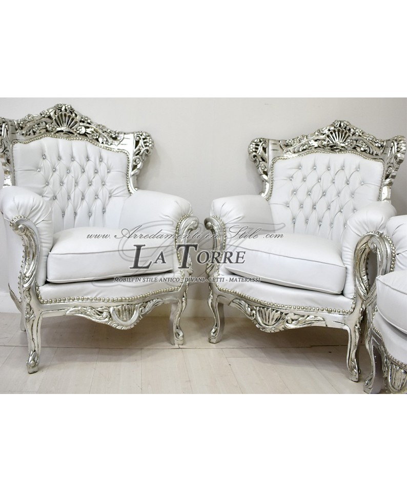 Divano Poltrona Germany Tavolino Salotto Foglia argento in stile Barocco ecopelle bianca AL1242