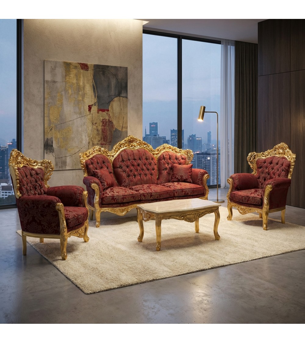 Le sedute e gli schienali sono rivestiti in raffinato tessuto damascato gigliato bordeaux, una tonalità intensa, calda e sofisticata che dona carattere e prestigio all’ambiente, creando un contrasto ricco e armonioso con la struttura dorata. La lavorazione capitonné impreziosisce divano e poltrone con un elegante effetto trapuntato, esaltando profondità e morbidezza. Gli intagli scolpiti a mano e le finiture in foglia oro completano un’estetica opulenta e di forte personalità.