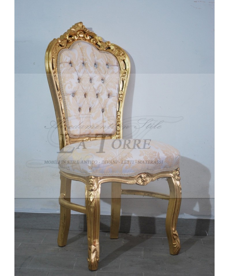 Poltrona sedia still , con struttura è realizzata in legno in foglia oro, pregiato, sapientemente intagliato con motivi curvilinei che ne esaltano la forma regale. Lo schienale e la seduta sono imbottiti e rivestiti in tessuto gigliato avorio, con una lavorazione capitonnè sullo schienale che aggiunge profondità e raffinatezza. I bottoni a vista sullo schienale non sono semplici borchie, ma swarovski che catturano la luce, conferendo un ulteriore elemento di lusso. I dettagli , finemente applicati sulle curve dello schienale e sulla parte superiore delle gambe anteriori, arricchiscono ulteriormente il design, creando un contrasto visivo accattivante con il legno dorato e il tessuto gigliato avorio. Le gambe anteriori presentano una leggera curvatura, mentre quelle posteriori sono più dritte, conferendo stabilità e un profilo aggraziato.