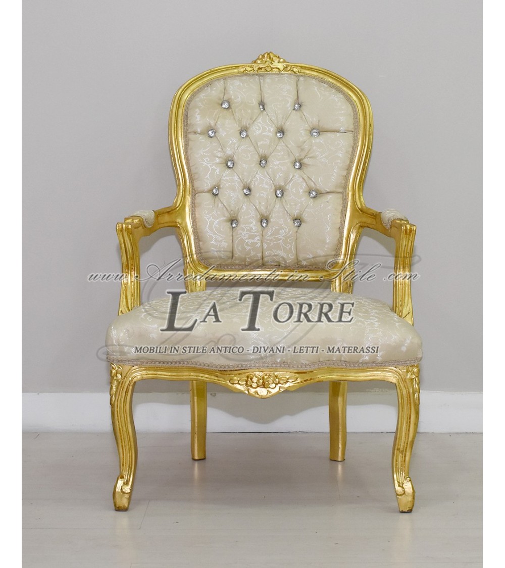 Poltrona futè sedia con braccioli Luigi XV con struttura interamente realizzata in pregiato legno intagliato e rifinita con una lussuosa foglia oro, che ne esalta le curve sinuose e le intricate decorazioni tipiche dello stile. L'imbottitura, sia sullo schienale che sulla seduta, è rivestita in un sontuoso tessuto virginia avorio che aggiunge profondità e raffinatezza. Lo schienale capitonné è impreziosito da luminosi bottoni gioiello che catturano la luce, conferendo un tocco di scintillante glamour. I braccioli robusti e le gambe elegantemente curve, anch'essi dorati e finemente intagliati, contribuiscono a creare un pezzo d'arredo di grande impatto visivo. Questa poltrona non è solo un sedile, ma un vero e proprio elemento decorativo capace di trasformare qualsiasi ambiente in uno spazio di raffinata eleganza, ideale per salotti classici, studi prestigiosi o come pezzo unico in un ingresso sontuoso.