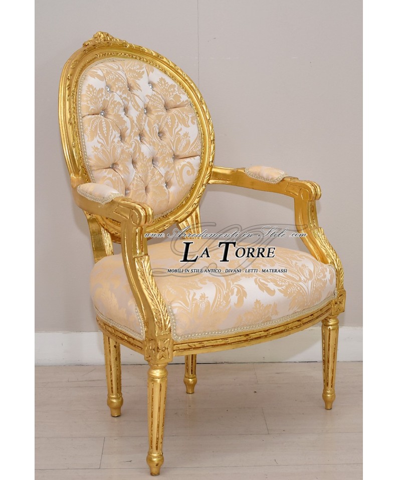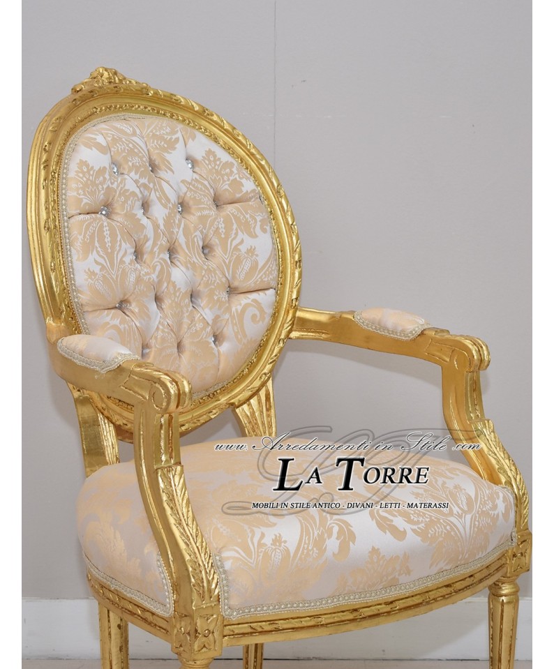 Poltrona Cordelia barocco braccioli in stile barocco , caratterizzata da una struttura in legno intagliato in foglia oro . La tappezzeria è di un tessuto damascato avorio, con un motivo decorativo tono su tono. Lo schienale è ovale e presenta una lavorazione capitonné con bottoni che sono impreziositi da swarovski , aggiungendo un tocco di brillantezza. I braccioli sono dritti e intagliati, e le gambe sono affusolate, anch'esse con intagli decorativi. Il sedile è imbottito e rivestito con lo stesso tessuto dello schienale.