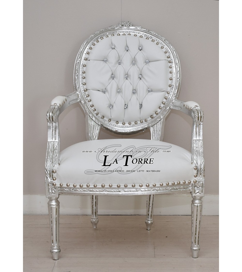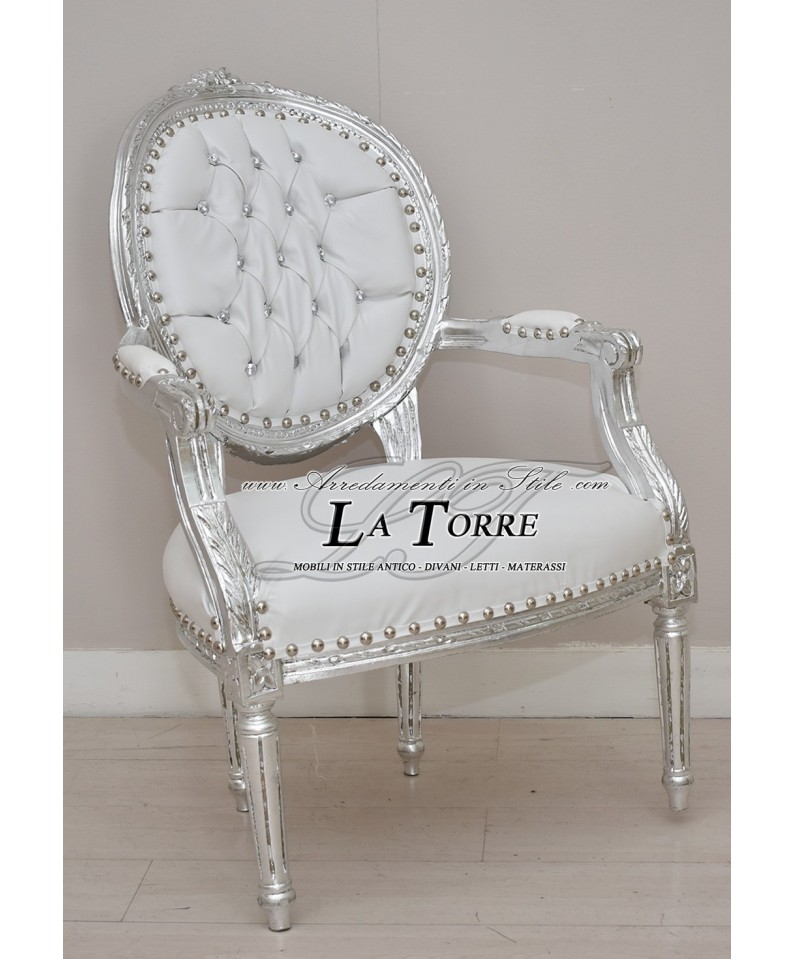 Poltrona Cordelia barocco braccioli in stile barocco , caratterizzata da una struttura in legno intagliato in foglia argento , la tappezzeria è di ecopelle bianco, mentre lo schienale è ovale e presenta una lavorazione capitonné con bottoni che sono impreziositi da swarovski , aggiungendo un tocco di brillantezza. I braccioli sono dritti e intagliati, e le gambe sono affusolate, anch'esse con intagli decorativi. Il sedile è imbottito e rivestito con lo stesso tessuto dello schienale.