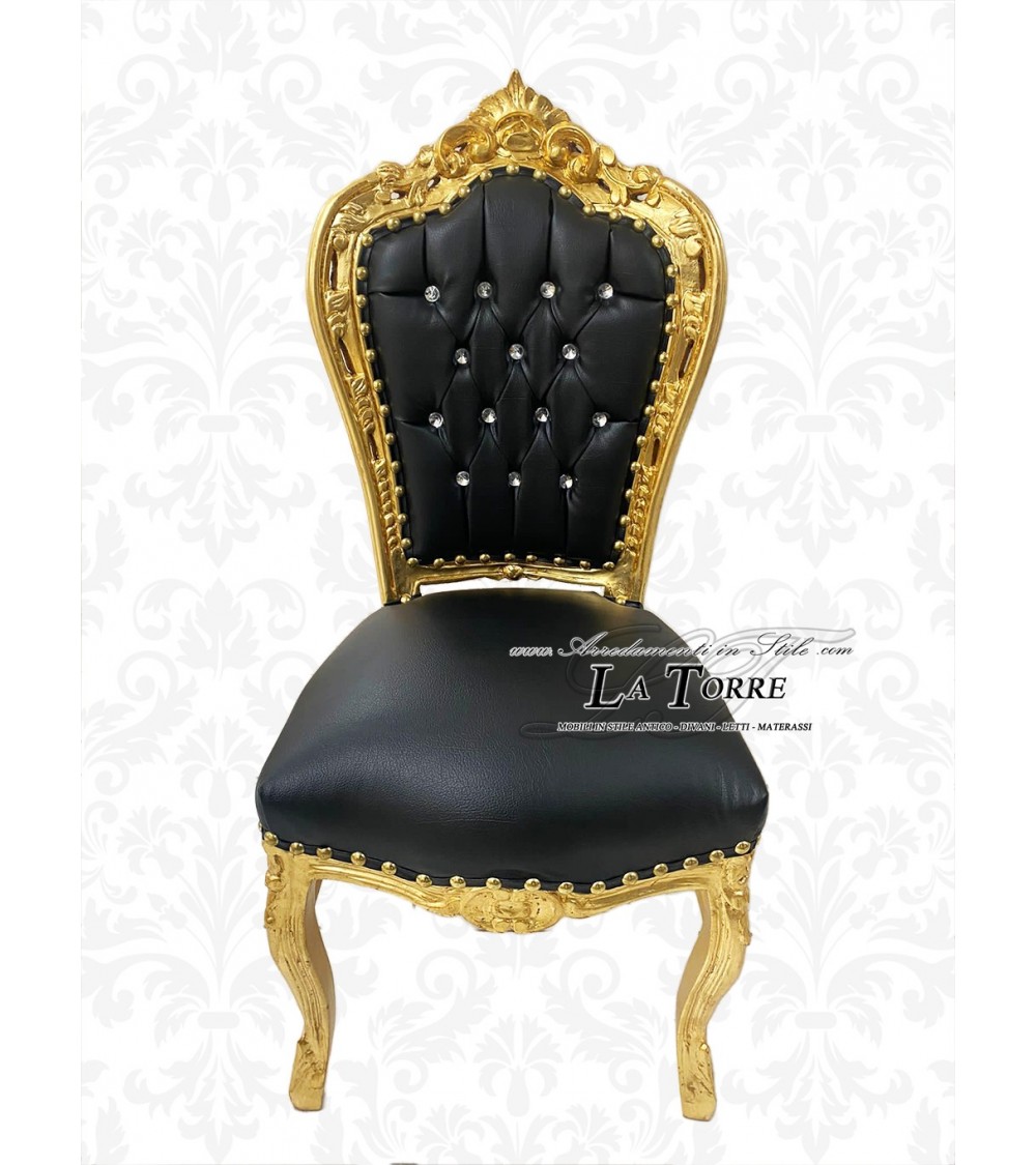 Poltrona Sedia Still Luigi XV Barocco Legno Oro ecopelle nero swarovski AL1826