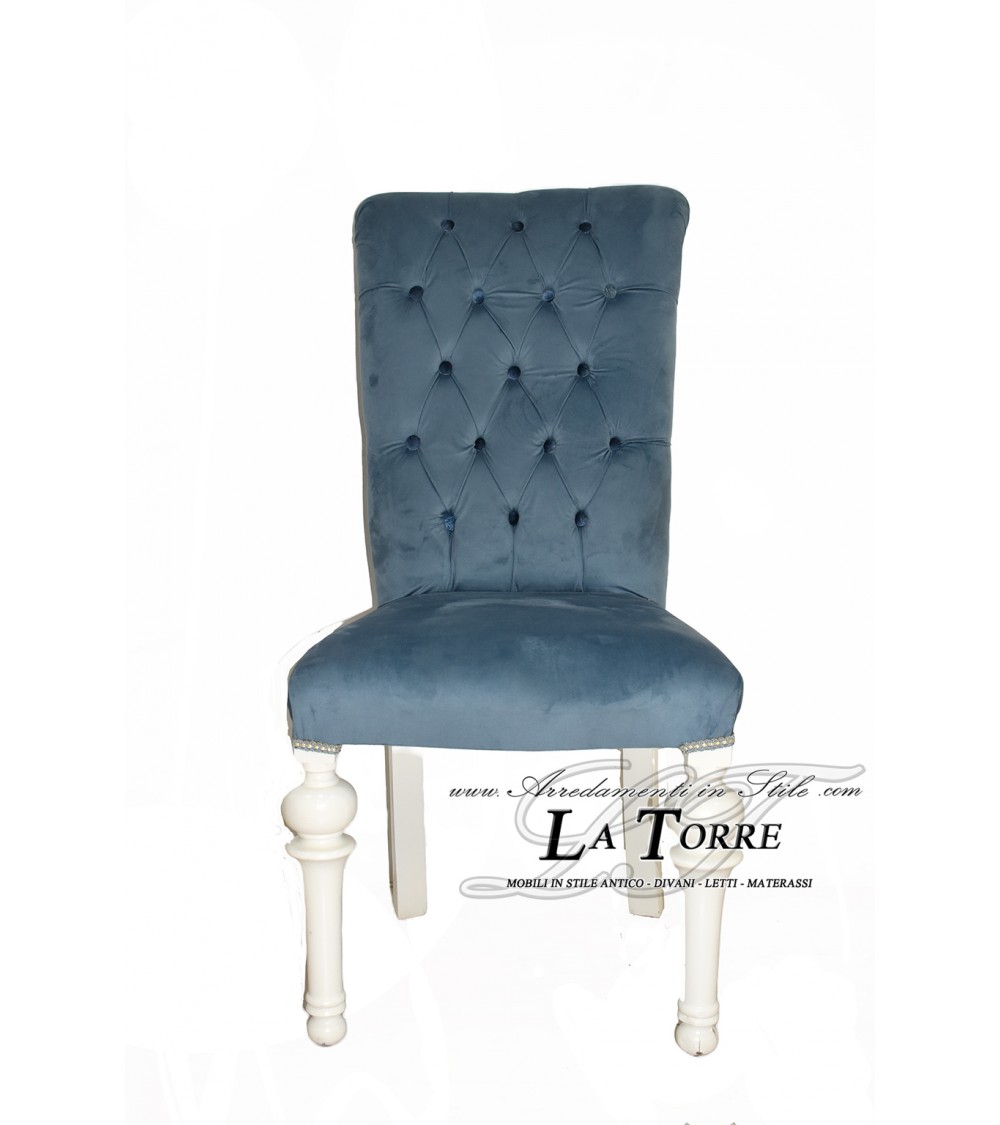 Poltrona sedia classico contemporaneo, presenta uno schienale alto e sagomato, rivestito in un lussuoso velluto azzurro , che conferisce una sensazione di morbidezza e raffinatezza. Lo schienale è caratterizzato da una sofisticata lavorazione capitonné, con pieghe profonde che creano un effetto visivo accattivante e offrono un supporto confortevole. La seduta è imbottita e rivestita nello stesso velluto, garantendo un'esperienza di seduta piacevole. Le gambe, con una delicata curva che evoca uno stile leggermente più classico, sono rifinite in bianco , creando un contrasto sottile ma elegante con il tessuto scuro.