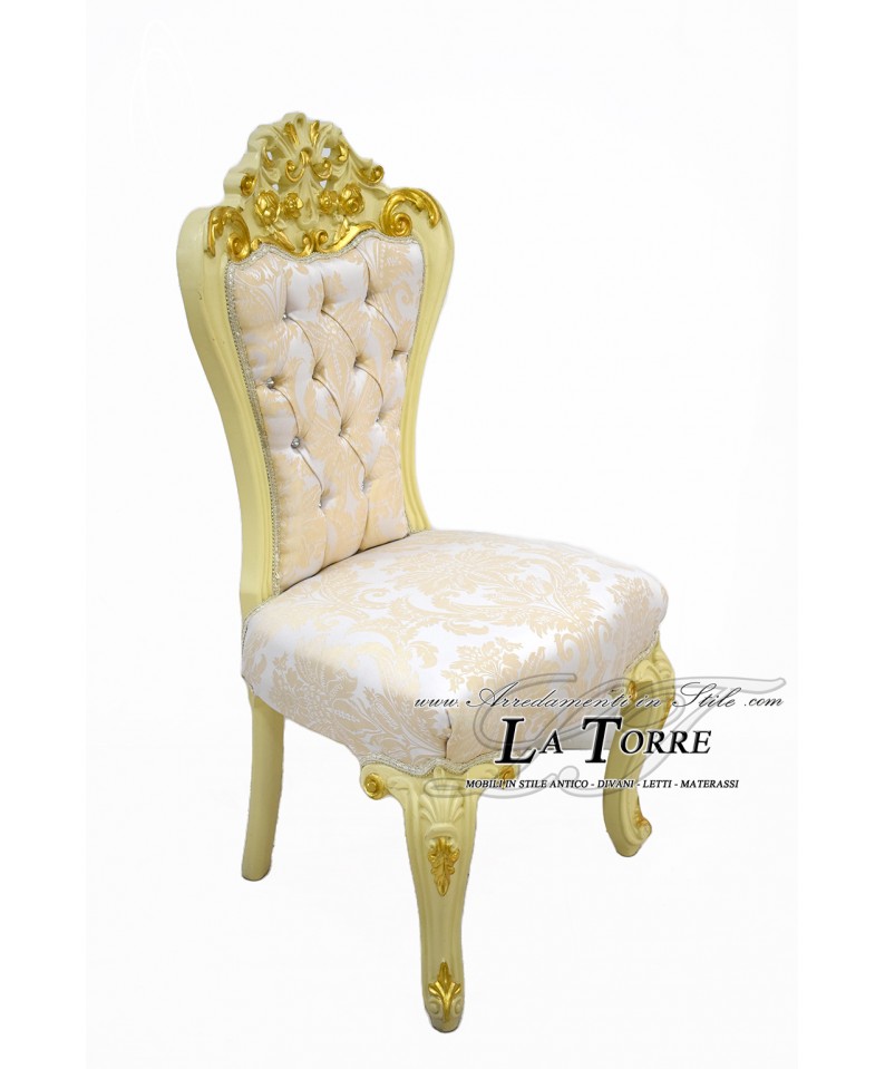 Sedia Poltrona Luigi XV Barocco Impero con struttura in legno in avorio con particolari in foglia oro, che le conferisce un aspetto luminoso e sofisticato. Lo schienale è alto e sagomato, con una cimasa superiore riccamente intagliata con motivi a conchiglia, riccioli e volute, evidenziati da una finitura dorata che contrasta elegantemente con il tessuto chiaro. Sia lo schienale che la seduta rivestiti in un pregiato tessuto champagne con giglio fiorentino, con motivi floreali o a volute tono su tono che ne arricchiscono la superficie. Lo schienale è impreziosito da una profonda lavorazione capitonné, con bottoni in swarovski, aggiungendo brillantezza e un tocco glamour. Ideale per una sala da pranzo classica, un salotto di lusso, o come elemento decorativo in un ambiente sofisticato.