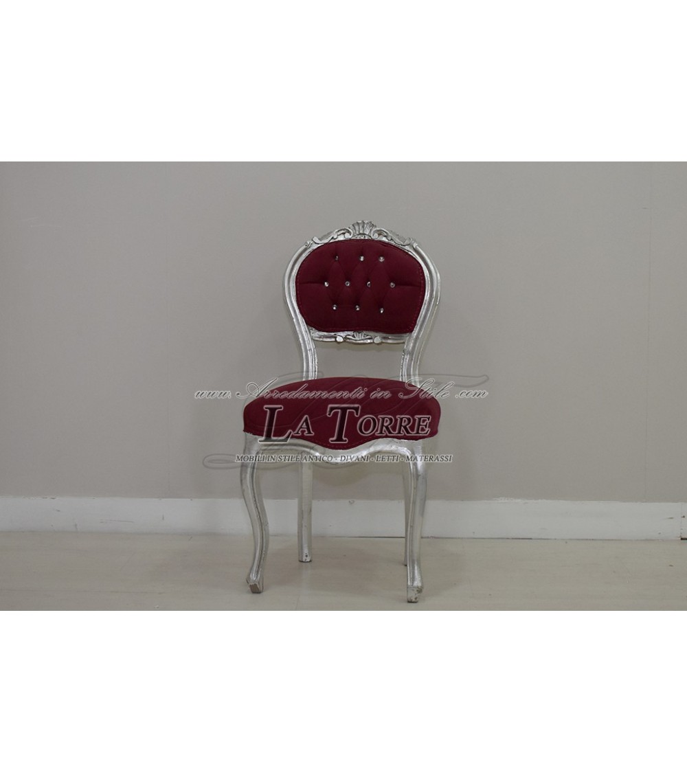 Sediolina luigi XV sedia musica interamente in legno, finemente intagliata e rifinita con foglia argento. La stessa , evidente su tutta la cornice dello schienale, sulle gambe e sul profilo della seduta, conferisce un aspetto sontuoso e luminoso, tipico degli arredi di lusso. Gli intagli sono visibili soprattutto sulla parte superiore dello schienale, con motivi floreali o a conchiglia che aggiungono un tocco di raffinatezza scultorea. Lo schienale è imbottito e rivestito in vellutino bordeaux. È caratterizzato da una lavorazione capitonné con bottoni in swarovski, aggiungendo un ulteriore punto di brillantezza e un'eleganza sofisticata. La forma dello schienale è ovale, incorniciata dalla foglia argento, le gambe sono a cabriolet, elegantemente curve, con piccole scanalature o intagli che ne seguono la forma, contribuendo alla leggerezza visiva e all'eleganza complessiva della sedia.