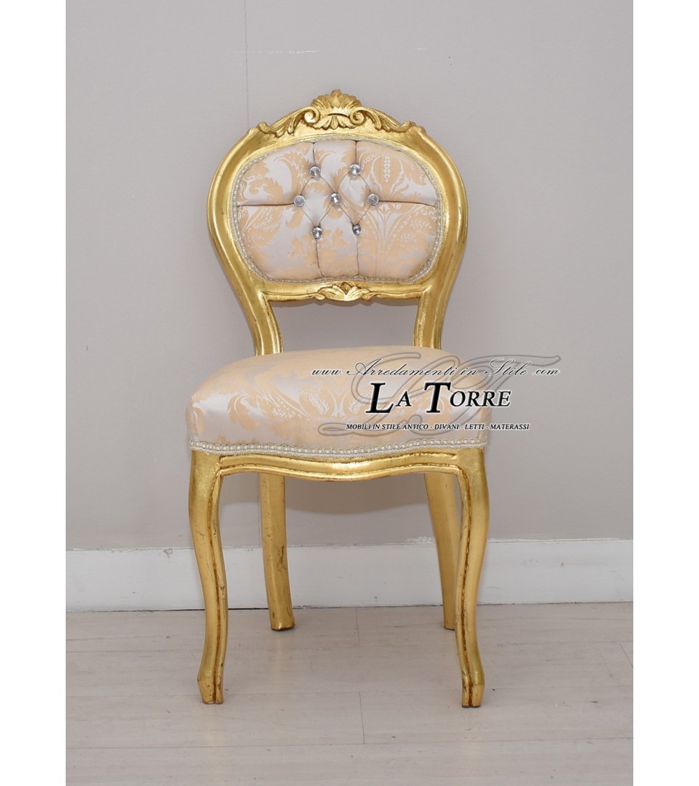 Sediolina luigi XV sedia musica interamente in legno, finemente intagliata e rifinita con foglia oro. La stessa , evidente su tutta la cornice dello schienale, sulle gambe e sul profilo della seduta, conferisce un aspetto sontuoso e luminoso, tipico degli arredi di lusso. Gli intagli sono visibili soprattutto sulla parte superiore dello schienale, con motivi floreali o a conchiglia che aggiungono un tocco di raffinatezza scultorea. Lo schienale è imbottito e rivestito in tessuto damascato champagne. È caratterizzato da una lavorazione capitonné con bottoni in swarovski, aggiungendo un ulteriore punto di brillantezza e un'eleganza sofisticata. La forma dello schienale è ovale, incorniciata dalla foglia oro, le gambe sono a cabriolet, elegantemente curve, con piccole scanalature o intagli che ne seguono la forma, contribuendo alla leggerezza visiva e all'eleganza complessiva della sedia.