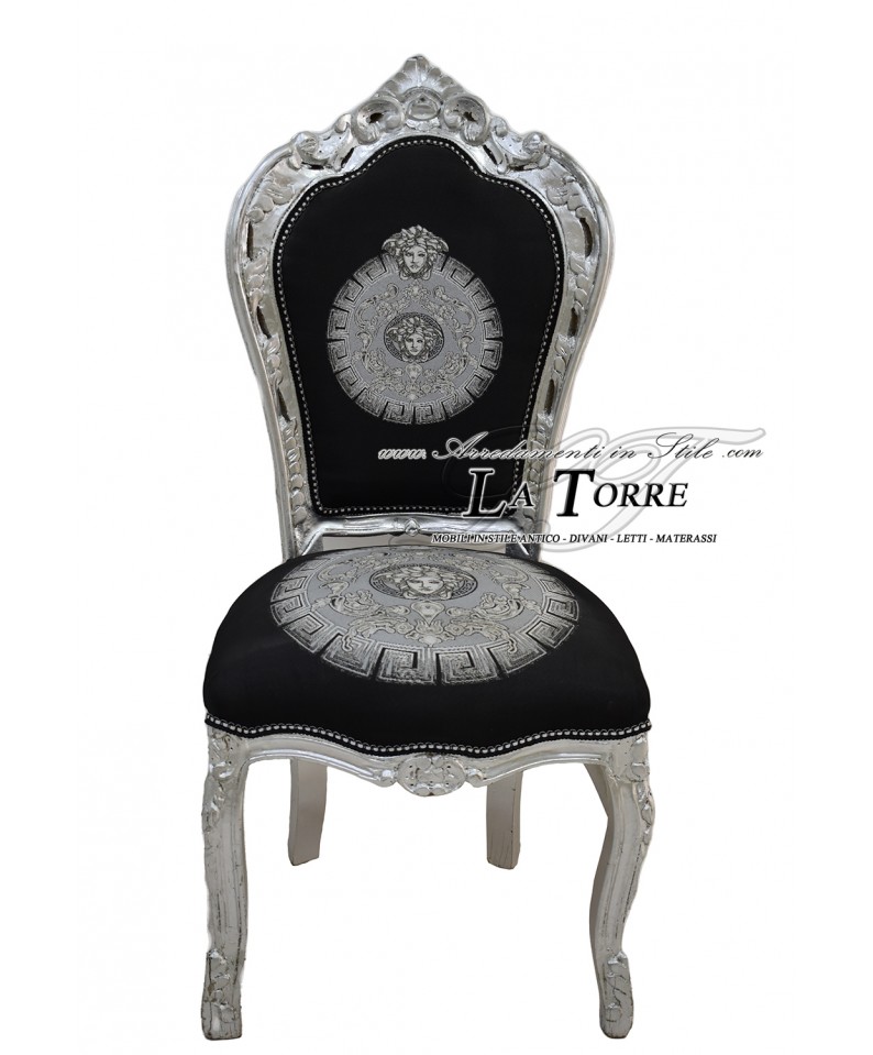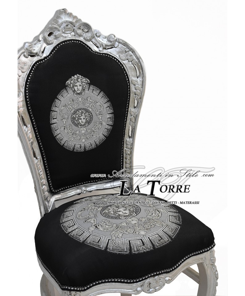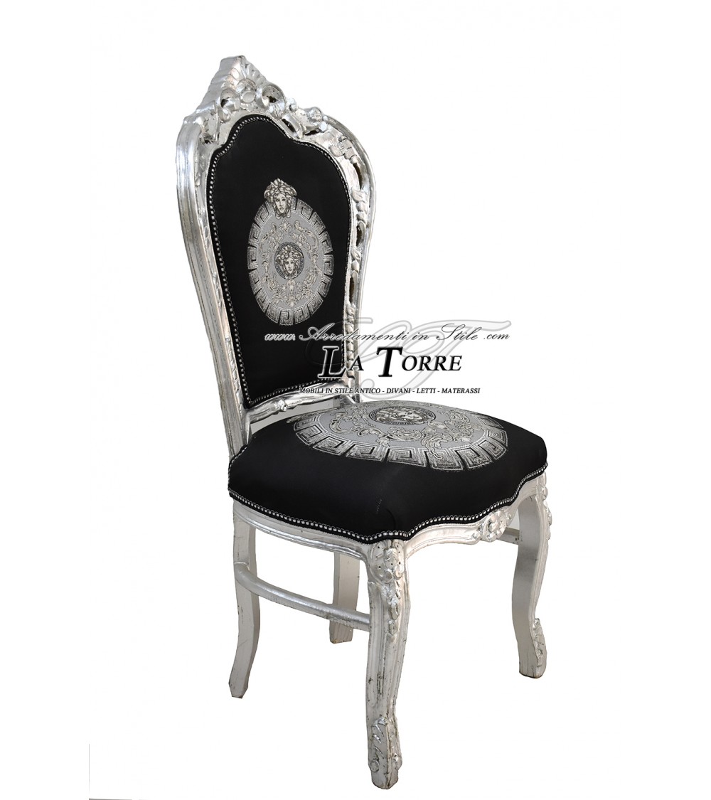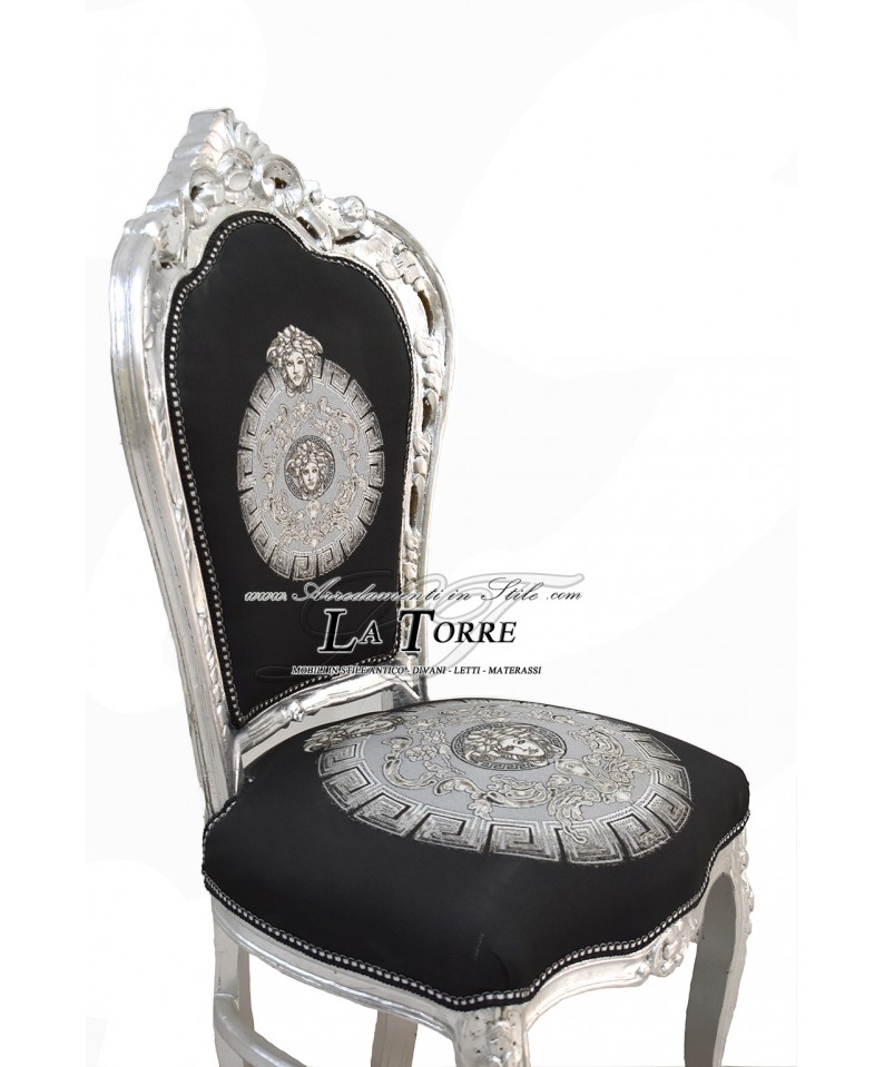 Sedia in stile barocco, caratterizzata da una struttura in legno finemente intagliato con una ricca finitura argentata. Lo schienale alto e la seduta sono imbottiti e rivestiti in un tessuto nero. La particolarità di questa sedia è la presenza di medaglioni decorativi, sia al centro dello schienale che sulla seduta, con motivi che richiamano teste mitologiche stilizzate, in tonalità dorate. Le gambe sono dritte nella parte anteriore e leggermente curve in quella posteriore, con intagli alla base dello schienale e della seduta. È un pezzo d'arredamento di grande impatto visivo, che evoca lusso e sfarzo, ideale per ambienti che desiderano un'atmosfera regale e opulenta.