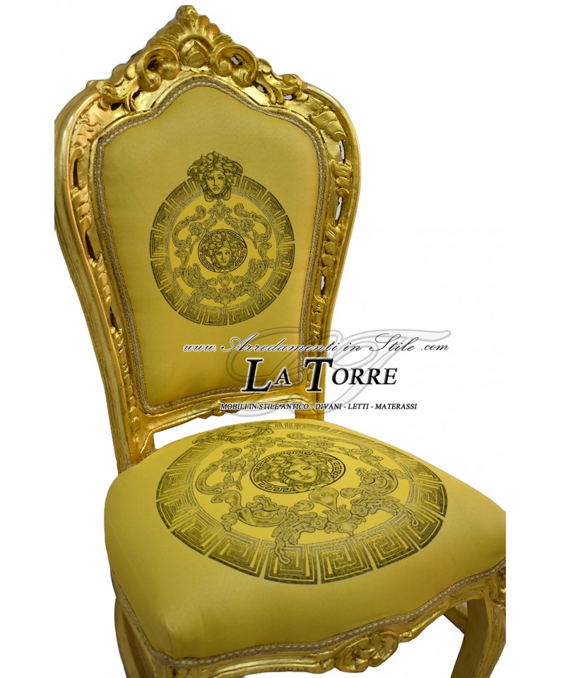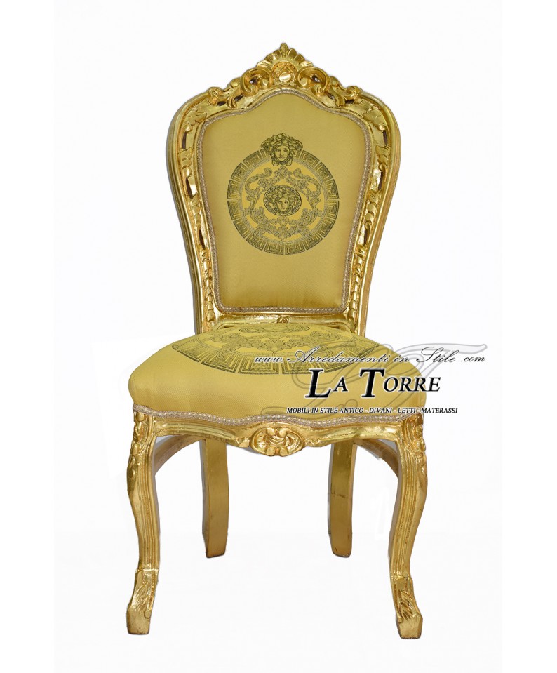 Sedia in stile barocco, caratterizzata da una struttura in legno finemente intagliato con una ricca finitura dorata. Lo schienale alto e la seduta sono imbottiti e rivestiti in tessuto oro. La particolarità di questa sedia è la presenza di medaglioni decorativi, sia al centro dello schienale che sulla seduta, con motivi che richiamano teste mitologiche stilizzate, in tonalità dorate. Le gambe sono dritte nella parte anteriore e leggermente curve in quella posteriore, con intagli alla base dello schienale e della seduta. È un pezzo d'arredamento di grande impatto visivo, che evoca lusso e sfarzo, ideale per ambienti che desiderano un'atmosfera regale e opulenta.