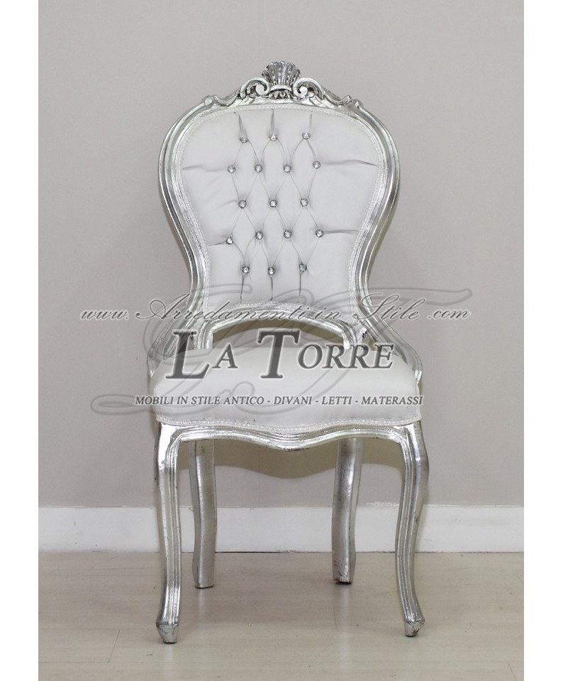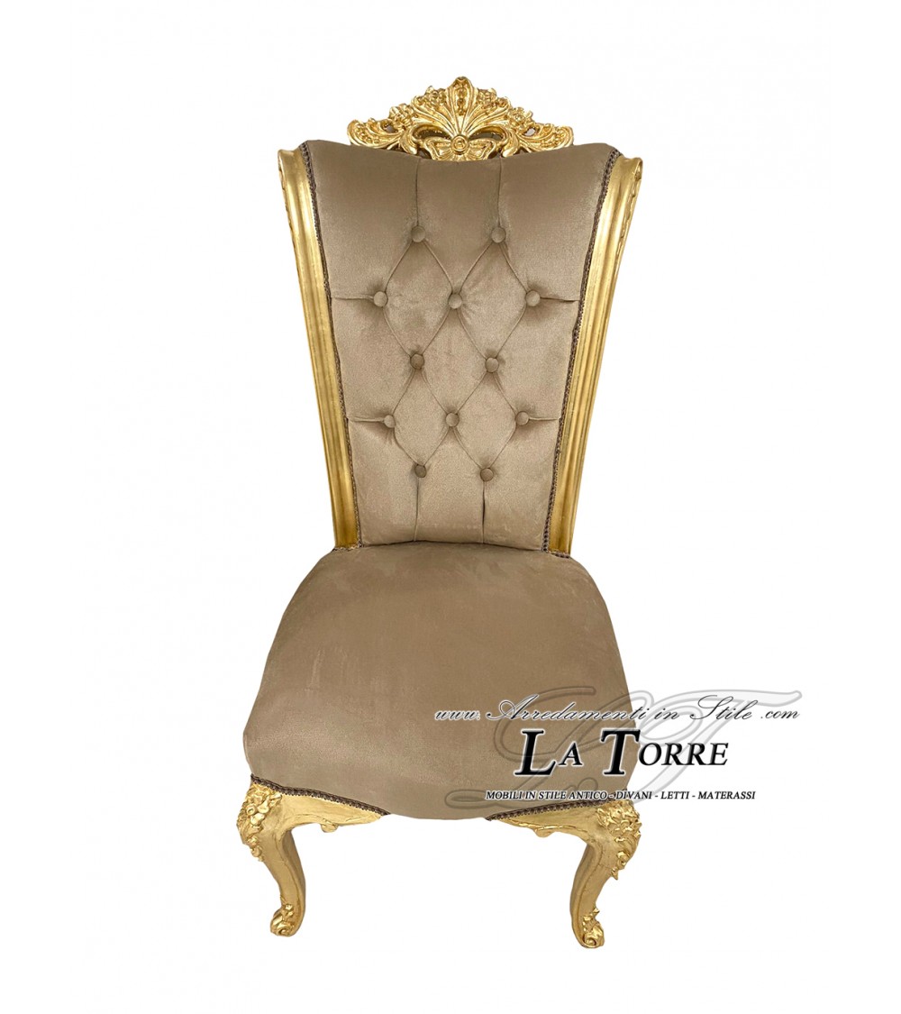 Sedia Poltrona classica Luigi XV Barocco Impero. La sedia è caratterizzata da una struttura imponente e riccamente lavorata. L'intera intelaiatura in legno, incluse le gambe e l'alta cornice dello schienale, è rivestita con una lussuosa finitura in foglia oro. La doratura è lucida e brillante, esaltando gli intricati intagli che adornano la parte superiore dello schienale, dove spicca una complessa decorazione barocca con volute, conchiglie e motivi floreali, tipici dell'opulenza di quello stile. Lo schienale è imbottito e rivestito in un elegante velluto color marrone, si abbina perfettamente alla doratura, creando un contrasto sofisticato. Lo schienale è impreziosito da una lavorazione capitonné, con bottoni in swarovski. La seduta è ampia e imbottita per garantire comfort, rivestita con lo stesso velluto, mentre le gambe anteriori sono robuste e con una leggera curva, tipiche dello stile barocco, anch'esse interamente dorate e con dettagli intagliati nella parte superiore, contribuendo alla stabilità e all'estetica regale della sedia.