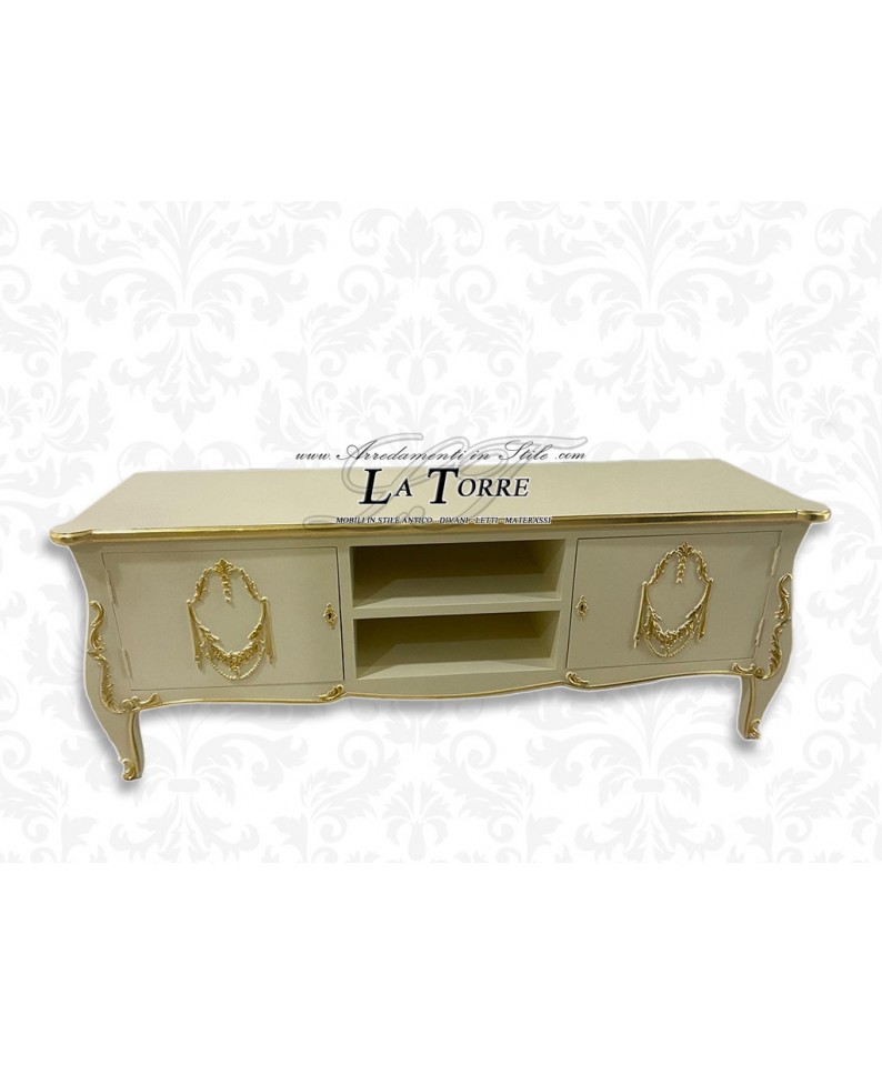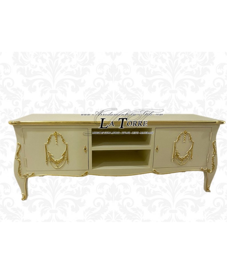Mobile porta TV in stile barocco realizzato in legno, laccato in colore avorio, che gli conferisce un aspetto luminoso e sofisticato, con particolari in foglia oro . Il mobile presenta un design simmetrico: al centro, un vano a giorno con due ripiani, ideale per ospitare decoder, lettori multimediali o altri dispositivi elettronici, con spazio per la gestione dei cavi. Ai lati del vano centrale, si trovano due ante a battente, i cui frontali sono decorati con elaborate applicazioni dorate a forma di ghirlande, nastri e medaglioni, che aggiungono un tocco di opulenza. Ideale per un salotto di lusso, una sala multimediale o una camera da letto padronale.