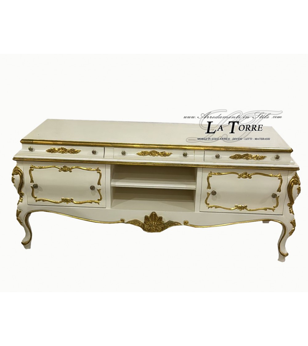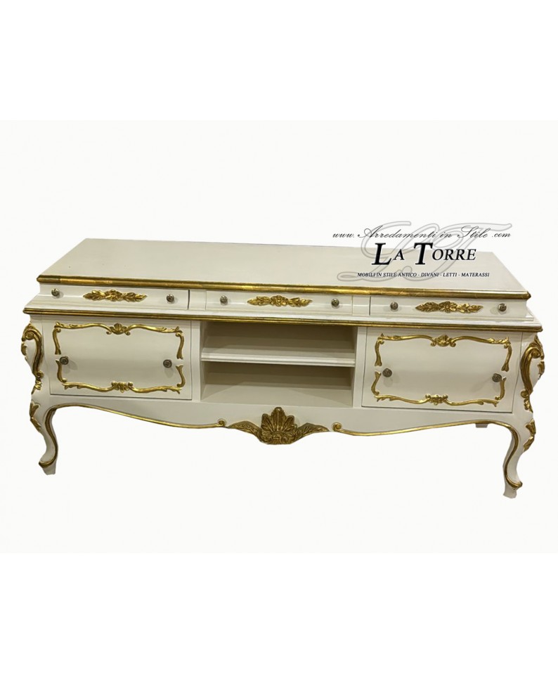 Mobile porta TV in stile barocco realizzato in legno, laccato in colore avorio, che gli conferisce un aspetto luminoso e sofisticato, con particolari in foglia oro . Il mobile presenta un design simmetrico: al centro, un vano a giorno con due ripiani, ideale per ospitare decoder, lettori multimediali o altri dispositivi elettronici, con spazio per la gestione dei cavi. Ai lati del vano centrale, si trovano due ante a battente, i cui frontali sono decorati con elaborate applicazioni dorate a forma di ghirlande, nastri e medaglioni, che aggiungono un tocco di opulenza. Ideale per un salotto di lusso, una sala multimediale o una camera da letto padronale.
