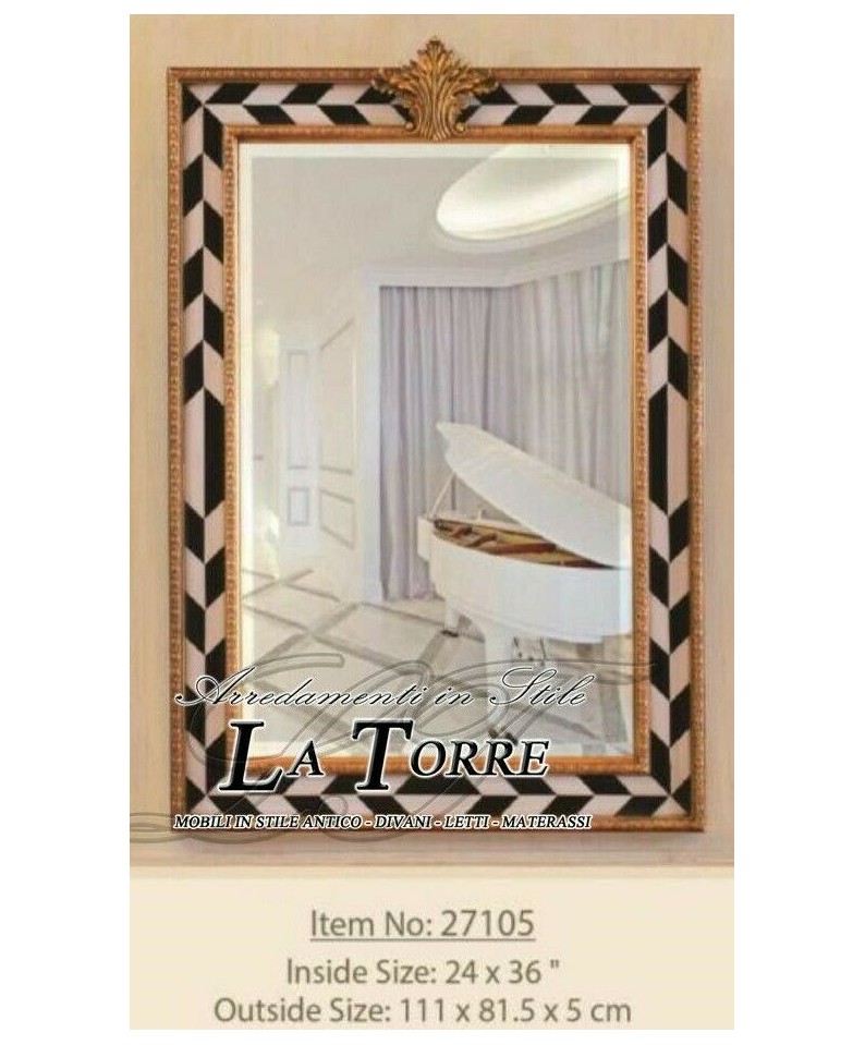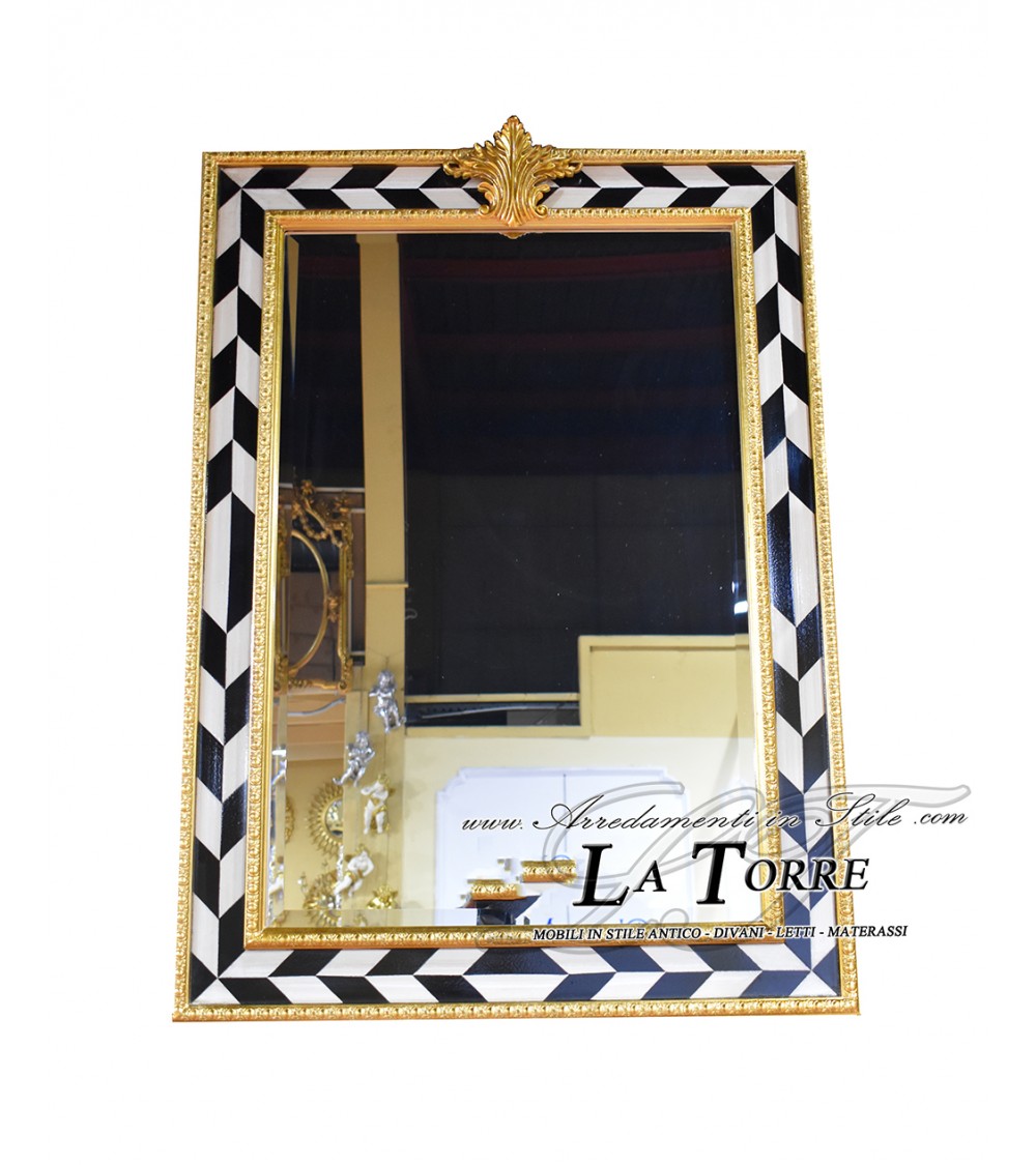 Originale specchiera rettangolare da parete con un design audace e contemporaneo. La cornice presenta un motivo a chevron bianco e nero, delimitato da sottili bordi dorati. La cimasa superiore è ornata da un elemento decorativo dorato in stile classico, creando un interessante contrasto tra il motivo geometrico moderno e il dettaglio tradizionale. Un pezzo d'arredamento di carattere, ideale per aggiungere un tocco di originalità e stile ad un ambiente.