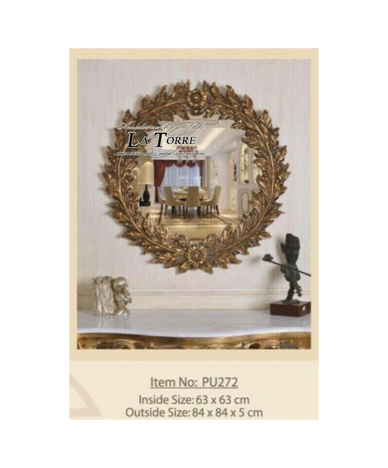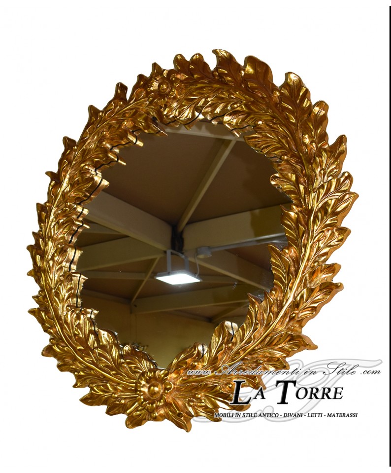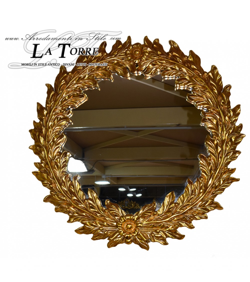 Splendido specchio da parete rotondo con una sontuosa cornice dorata scolpita a forma di corona d'alloro. Le foglie d'alloro, finemente intagliate e dorate a foglia, si intrecciano creando un bordo ricco e tridimensionale. Alla base, un motivo floreale stilizzato aggiunge un ulteriore elemento decorativo. Un accessorio d'arredo di grande impatto visivo, perfetto per aggiungere un tocco di eleganza classica e maestosità ad un ambiente. Realizzato con maestria artigianale, questo specchio è un vero e proprio elemento di pregio.