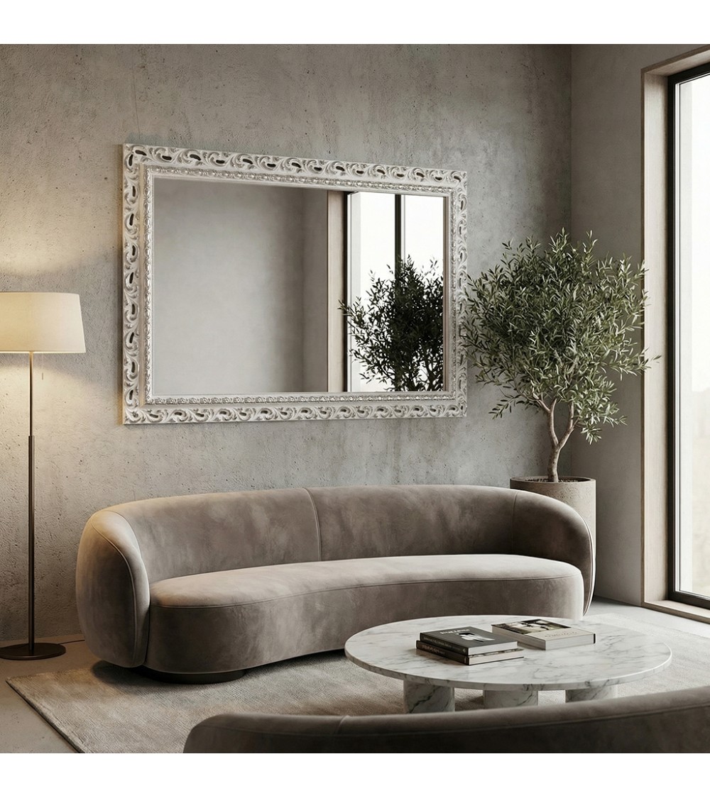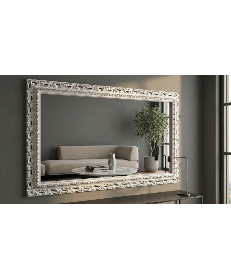 Elegante specchiera classica traforata in stile barocco, realizzata artigianalmente in legno e rifinita in una raffinata combinazione di bianco e argento. La cornice, caratterizzata da intagli traforati finemente lavorati, esprime tutta la ricchezza decorativa dello stile barocco, donando luminosità, profondità ed eleganza senza tempo all’ambiente.
