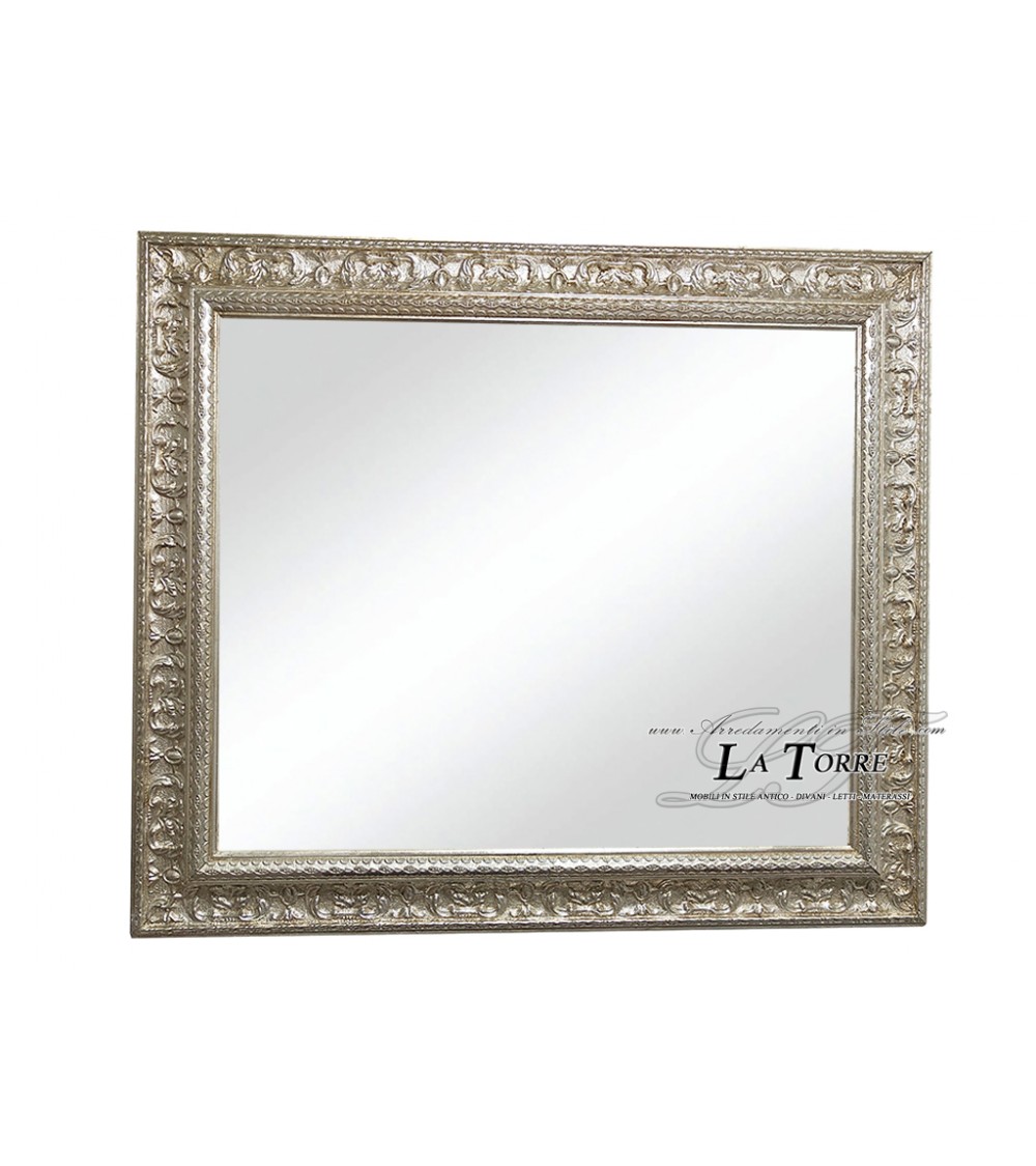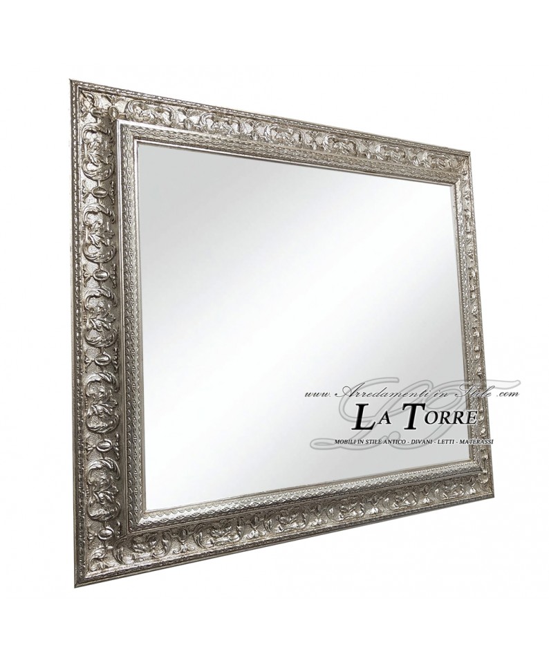 Specchio da parete presenta una cornice quadrata in stile barocco con una finitura in argento . La cornice è realizzata in legno e il suo design è caratterizzato da intagli elaborati e decorazioni floreali stilizzate, tipiche dello stile barocco.