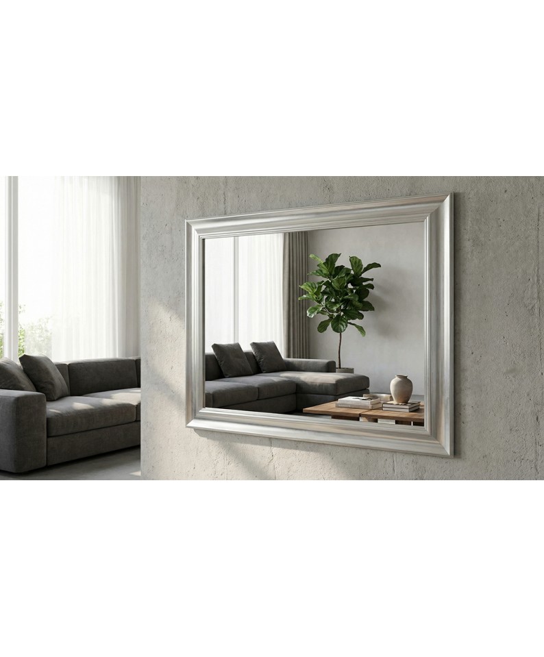 Elegante specchiera moderna su misura con cornice classica, caratterizzata da una raffinata finitura argento che unisce linee pulite e gusto contemporaneo a un profilo solido e decorativo. Il modello Rovescio è pensato per ambienti moderni, minimal o di transizione, dove lo specchio diventa un elemento d’arredo funzionale e di grande impatto visivo.