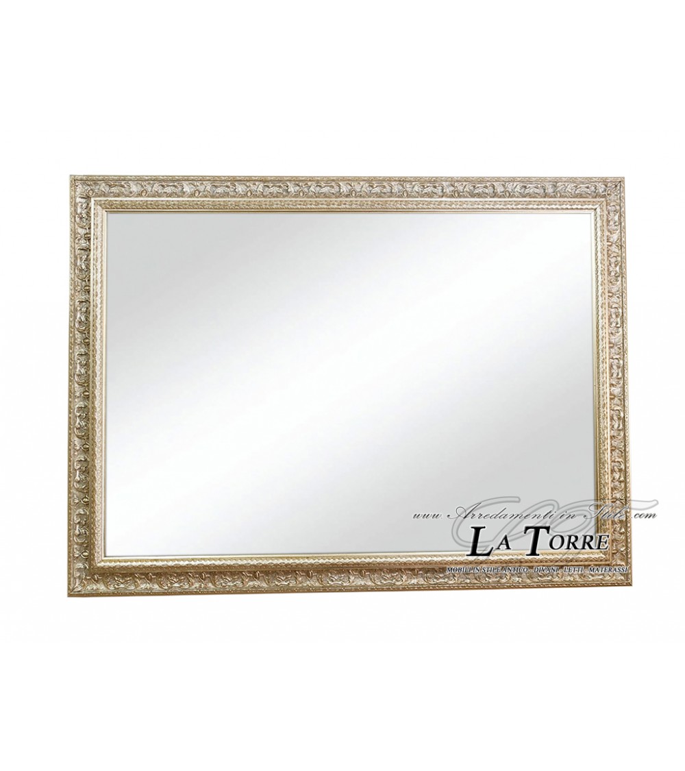 Specchio da parete presenta una cornice quadrata in stile barocco con una finitura in argento anticato. La cornice è realizzata in legno e il suo design è caratterizzato da intagli elaborati e decorazioni floreali stilizzate, tipiche dello stile barocco.