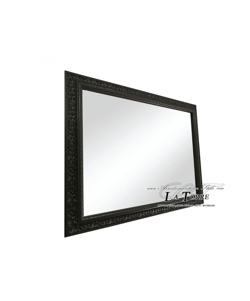 Specchio da parete presenta una cornice quadrata in stile barocco con una finitura in nero . La cornice è realizzata in legno e il suo design è caratterizzato da intagli elaborati e decorazioni floreali stilizzate, tipiche dello stile barocco.