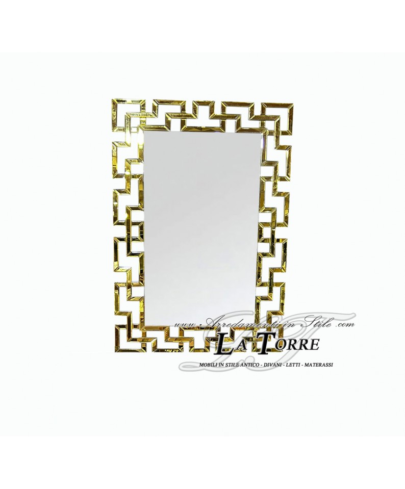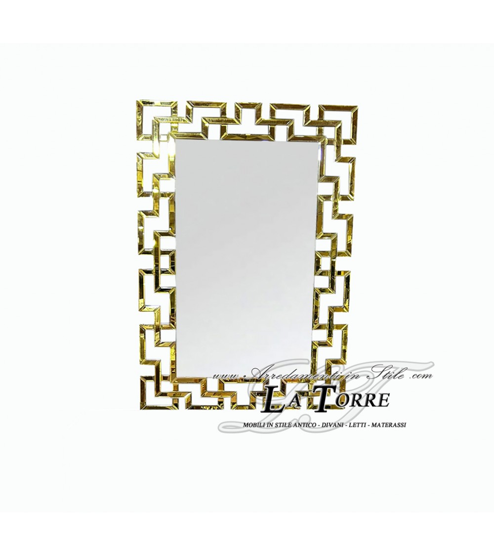 Porta un tocco di eleganza e prestigio nella tua casa con questa specchiera moderna caratterizzata da una cornice geometrica specchiata color oro.