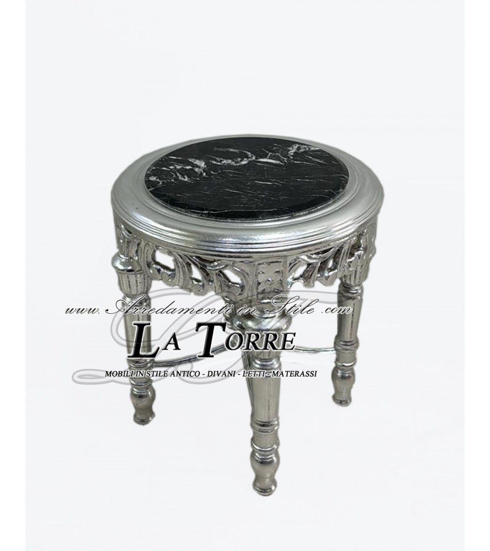 Tavolino Rotondo Barocco caratterizzato da una sontuosa struttura in legno, in foglia argento riccamente intagliata con motivi a traforo e riccioli che decorano la fascia sotto il piano, conferendo un aspetto elaborato e prezioso. Quattro robuste gambe tornite, che ricordano colonnine, sostengono il tavolino e sono unite da una base a croce per maggiore stabilità, che ne esalta le forme e i dettagli scultorei. Il piano superiore è circolare e realizzato in marmo nero, con venature sottili, che aggiunge un tocco di eleganza naturale e praticità alla superficie.