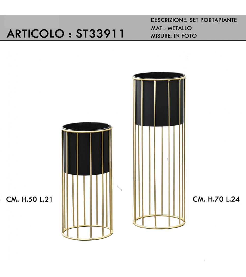 Set due porta piante da salotto moderni rotondi in metallo colore oro e vaso nero ST33911