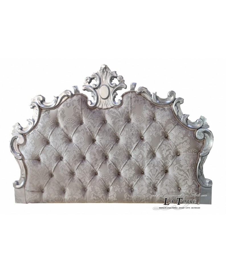 La struttura sottostante, finemente realizzata in legno e rifinita in foglia argento, incornicia con maestria il prezioso rivestimento, esaltandone la ricchezza e donando un contrasto cromatico delicato ma d'impatto. Questa combinazione di materiali pregiati e lavorazioni elaborate rende la testiera un punto focale di grande prestigio in qualsiasi camera da letto, ideale per ambienti che desiderano un'atmosfera opulenta e ricercata, dal gusto classico.