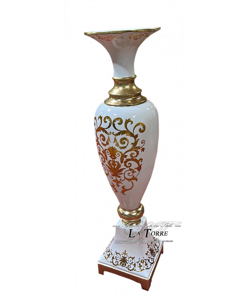 Vaso decorativo in ceramica, imponente per le sue dimensioni e la sua forma slanciata, di un raffinato color avorio. La superficie è arricchita da un sontuoso decoro centrale a volute in oro, che richiama uno stile classico e opulento. Il vaso presenta sezioni dorate ben definite: una fascia alla base del collo svasato, una sezione centrale che funge da raccordo e una base quadrata anch'essa dorata, che gli conferisce stabilità e un ulteriore tocco di lusso.