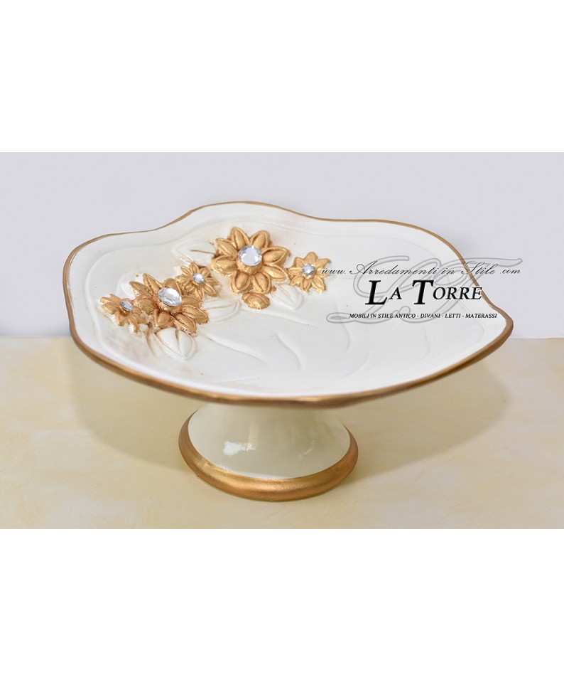 Portafrutta con piedistallo tema girasole in ceramica . Il piatto ha una forma irregolare con bordi ondulati ed è realizzato con una finitura lucida di colore avorio. Sulla superficie presenta decorazioni floreali a rilievo, con fiori tridimensionali, girasoli impreziositi da strass lucidi al centro. Il bordo del piatto e la base del piedistallo sono rifiniti in foglia oro lucido. È un pezzo d'arredo elegante e sontuoso, ideale come centrotavola o per servire in occasioni speciali.