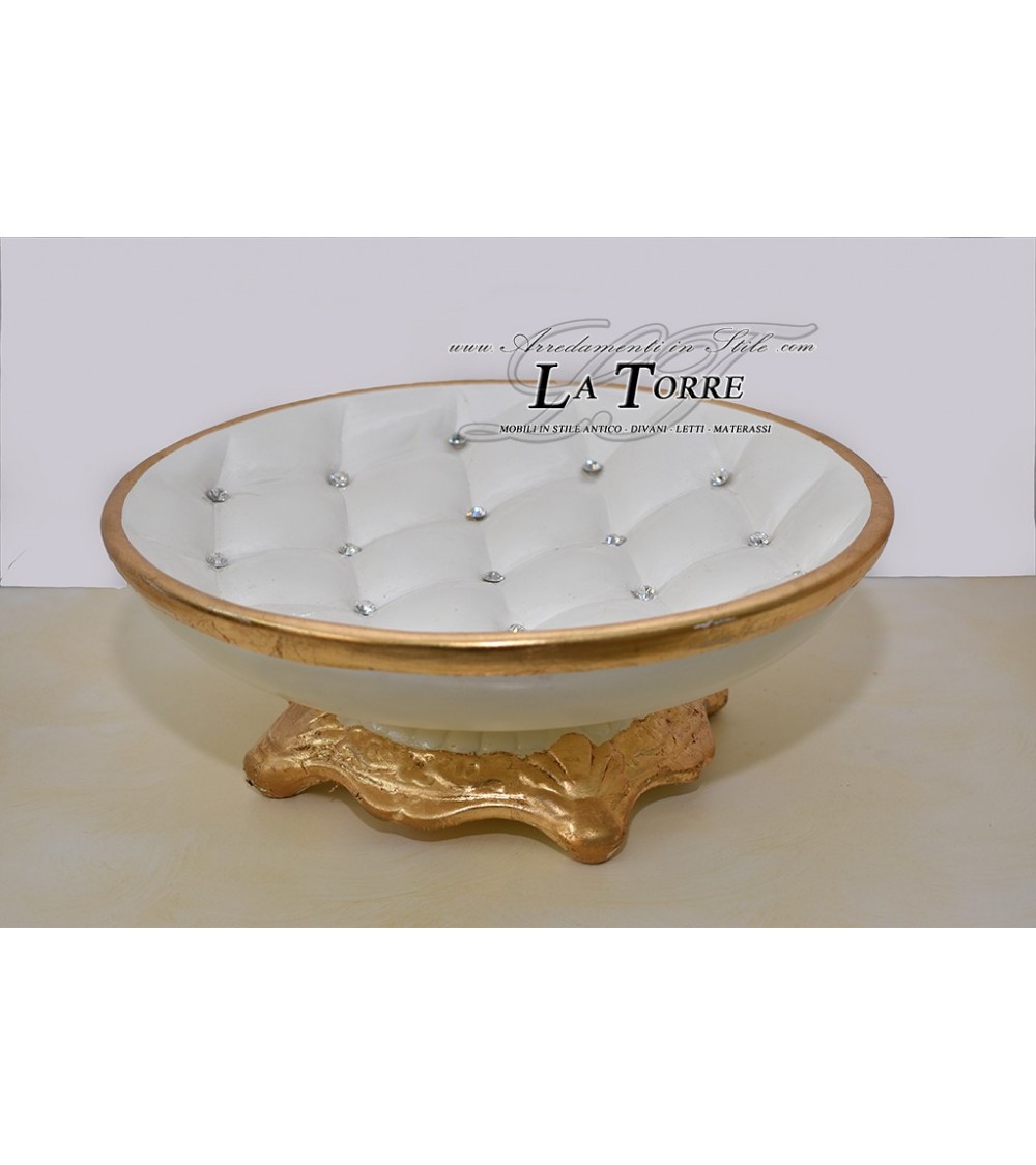 Centrotavola portafrutta con piedistallo. Il centrotavola ha una finitura esterna in avorio con particolari in foglia oro, mentre l'interno presenta una superficie imbottita e trapuntata, impreziosita da strass lucidi. Il bordo e il piedistallo intagliato sono rifiniti in una brillante in foglia oro, creando un contrasto lussuoso. È un pezzo d'arredo sontuoso e ornamentale, che combina un design classico con un tocco moderno e luminoso.