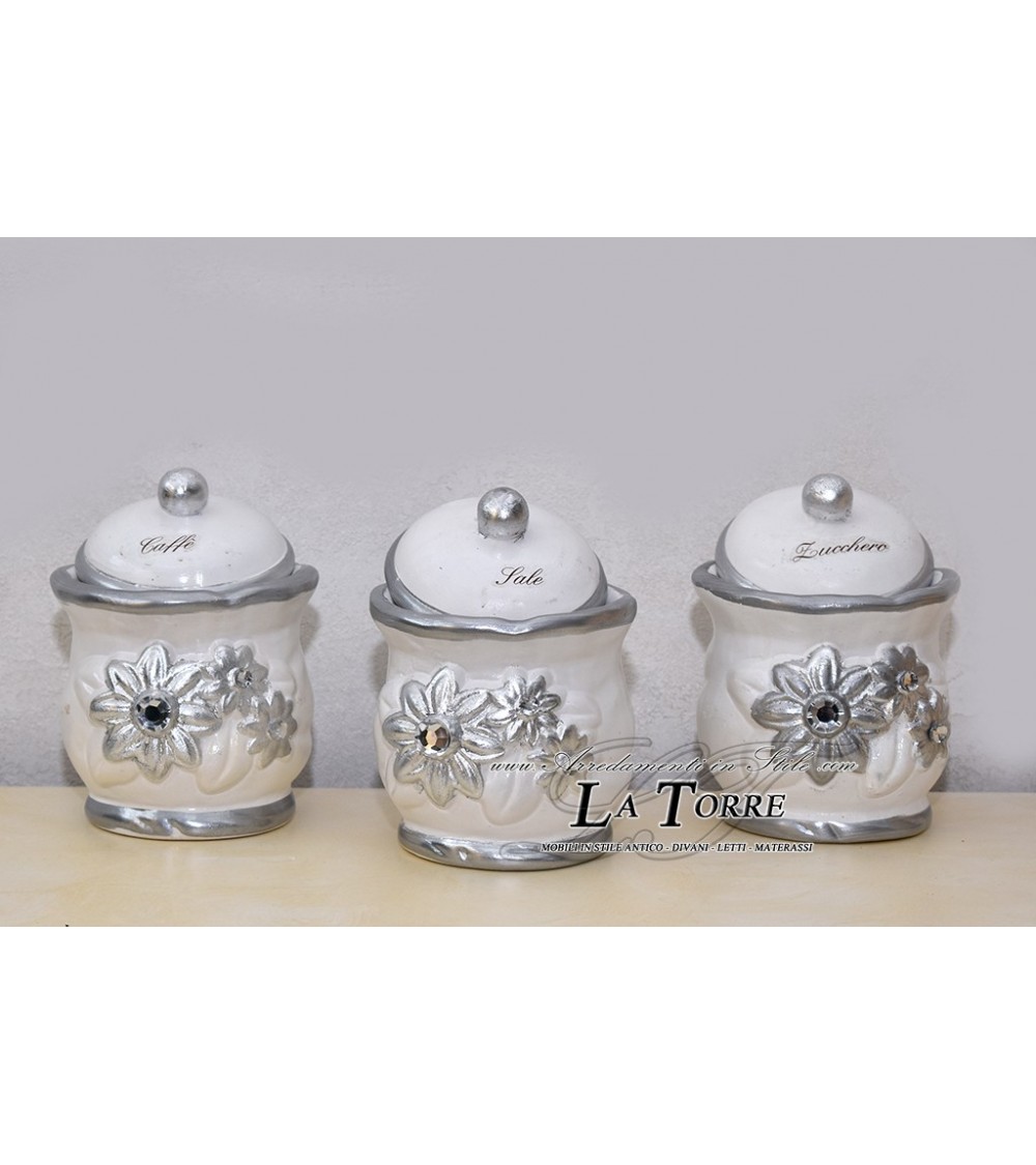 Tris set 3 pezzi barattoli in ceramica linea girasole sale zucchero caffè. Sono realizzati in ceramica con una finitura lucida di colore bianca con particolari in foglia argento. Le scritte 'Caffè', 'Sale' e 'Zucchero' sui coperchi indicano il contenuto. Ogni barattolo è decorato con fiori a rilievo rifiniti in argento lucido, come girasoli, impreziositi da strass al centro. Il bordo inferiore e i pomelli dei coperchi sono anch'essi argentati. Il set ha un aspetto elegante e lussuoso, che combina funzionalità e decorazione.