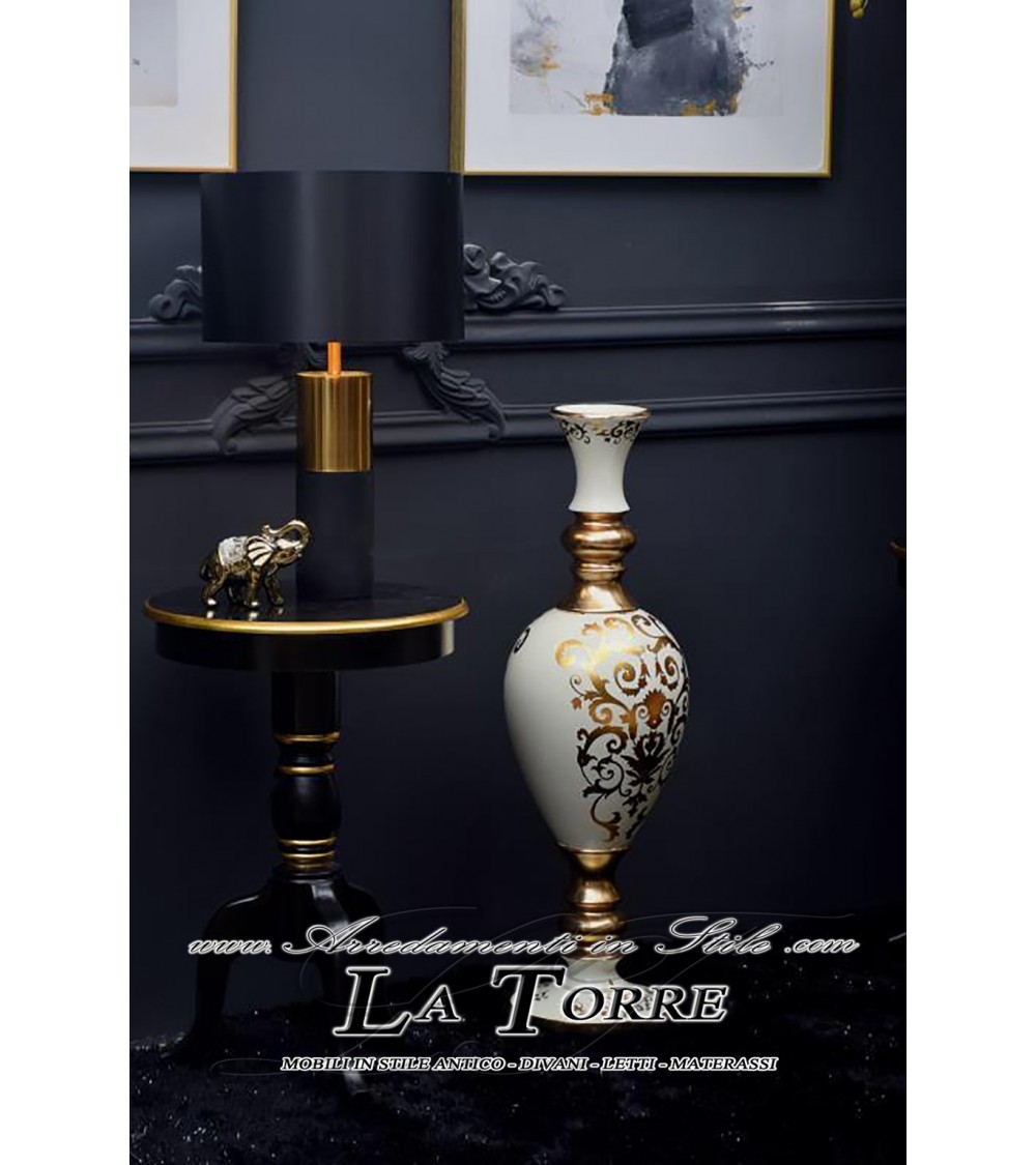 Vaso decorativo in ceramica, dal design raffinato e slanciato, di un delicato color avorio. La sua superficie è riccamente impreziosita da motivi a voluta in oro, che richiamano uno stile classico e opulento. Il vaso presenta una sezione centrale bombata e un collo svasato, entrambi con dettagli e finiture dorate che ne accentuano il lusso. Poggia su una base circolare, anch'essa dorata, che aggiunge stabilità ed eleganza. L'oggetto è posizionato su una superficie scura, affiancato da un tavolino nero e oro con una lampada coordinata e un piccolo soprammobile a forma di elefante dorato, creando un'atmosfera di sofisticata eleganza.