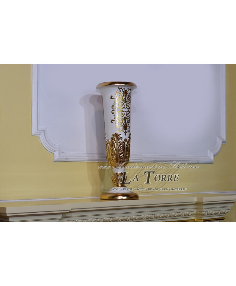 Questo è un piccolo e lussuoso vaso decorativo, caratterizzato da un design classico e opulento. La parte superiore è di colore bianco con intricati motivi dorati a volute, mentre la parte inferiore è interamente dorata con dettagli scolpiti in rilievo, con decorazioni classiche. La forma è slanciata, con un collo affusolato che si allarga verso la base. Si tratta di un pezzo d'arredo che si inserisce perfettamente in ambienti dallo stile sontuoso e tradizionale.