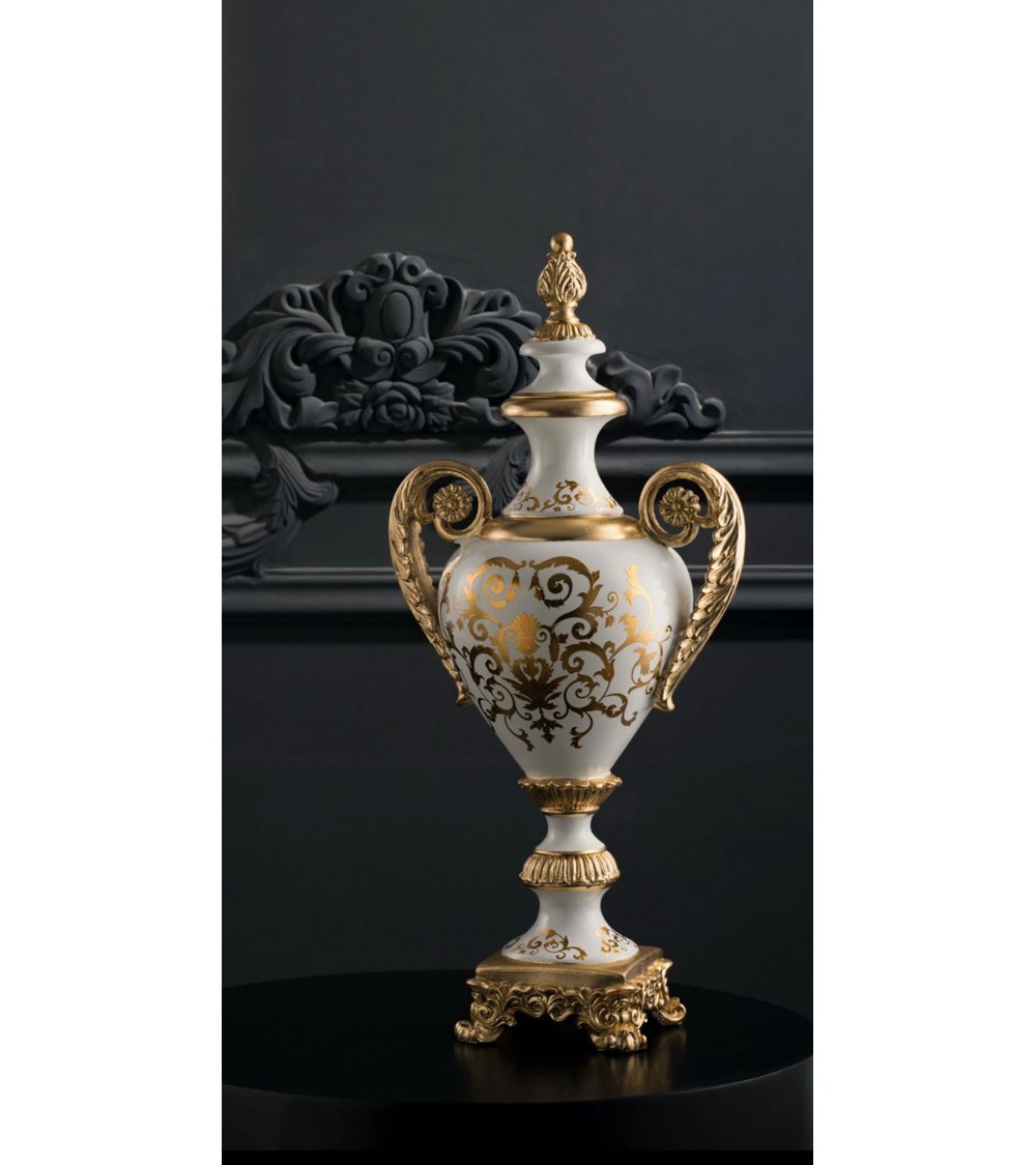 Questo è un vaso decorativo, o urna, dal design estremamente lussuoso e classico. È caratterizzato da una base bianca con elaborati motivi dorati a volute e da due grandi manici ricurvi interamente dorati. L'urna ha anche un coperchio con un pomello decorativo dorato. La base, anch'essa dorata, è scolpita con ricchi dettagli. È un pezzo d'arredo molto opulento e di grande impatto visivo.