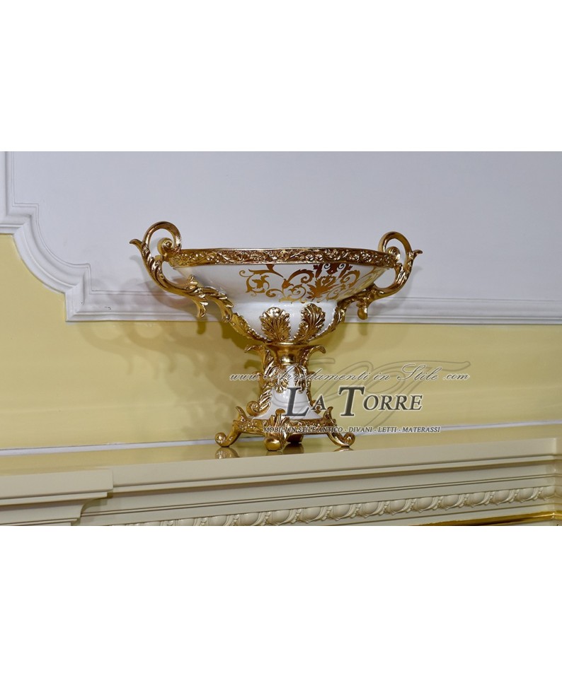 Questo è un elegante centrotavola vaso a coppa in stile classico. Ha una forma ampia e poco profonda, con due grandi manici dorati e ornati. La parte superiore è bianca con un motivo decorativo dorato, mentre la base e la sezione inferiore sono interamente dorate e riccamente scolpite con dettagli in rilievo. È un pezzo d'arredo molto opulento e di grande impatto visivo.