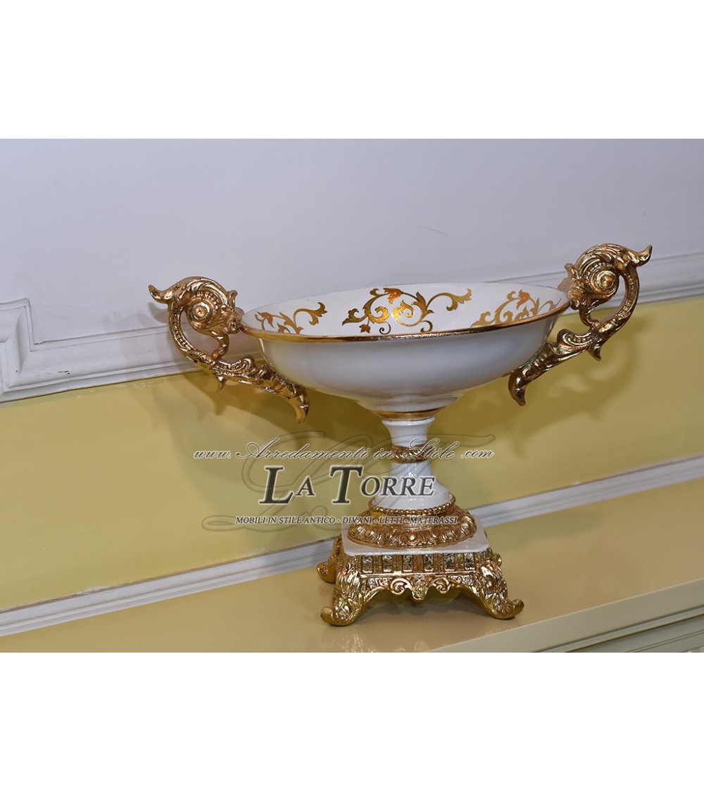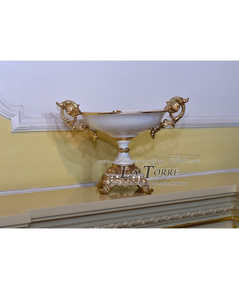 Portaconfetti alzatina ceramica centrotavola in stile classico. Si presenta come una coppa ampia e ovale, di colore avorio con un elegante bordo dorato e motivi ornamentali. La caratteristica principale sono i due grandi manici, interamente dorati e scolpiti con dettagli molto elaborati, che sembrano richiamare figure mitologiche o creature fantastiche. La coppa poggia su un piedistallo e una base quadrata, anch'essi riccamente decorati in oro.