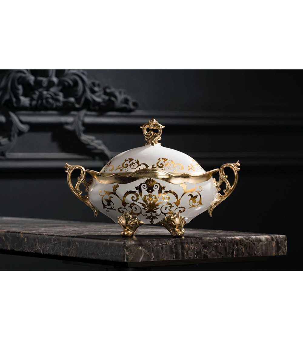 Zuppiera centrotavola Porta confetti potiche ceramica avorio e oro soprammobile RA15