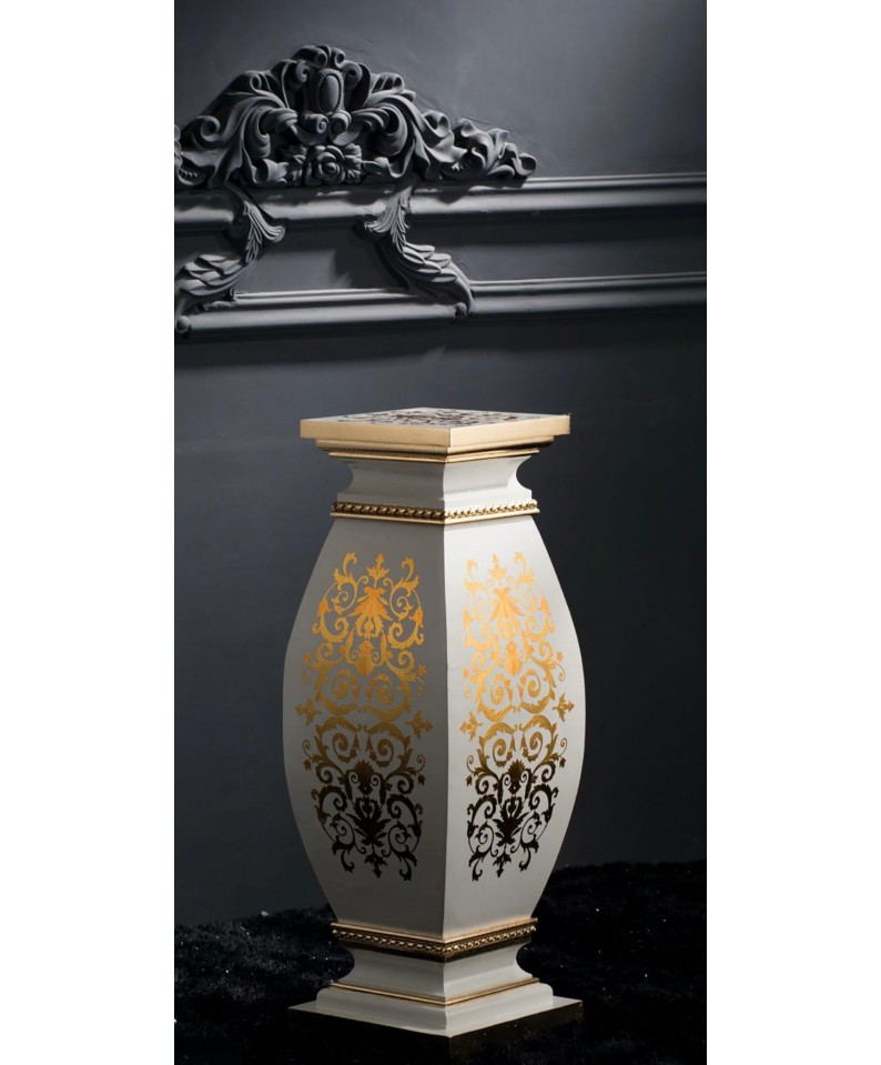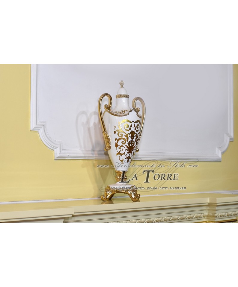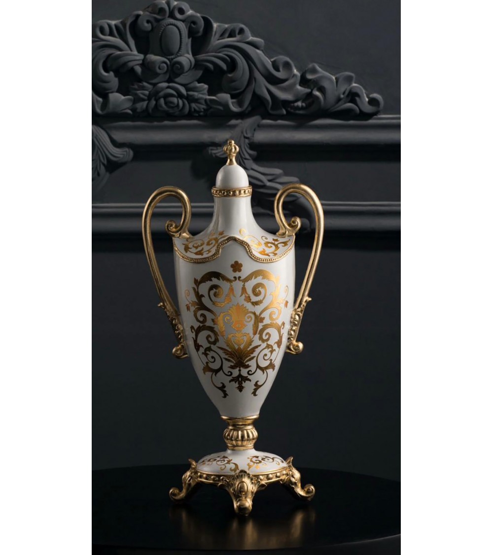 Anfora coppa con manici in ceramica , dal design sontuoso e in stile classico. Ha una forma elegante e affusolata, di colore bianco con ricchi decori dorati. È caratterizzato da un coperchio con un pomello decorativo e da due grandi manici, anch'essi dorati e scolpiti in modo elaborato. L'urna poggia su un piedistallo e una base dorata, molto ornati.