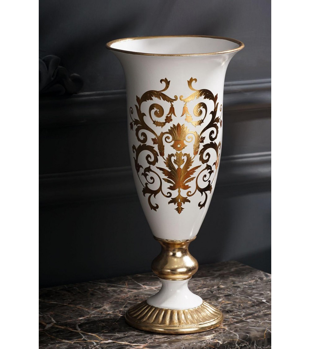 Anfora coppa ceramica alto e slanciato centrotavola in stile barocco. Si distingue per la sua forma a tromba o calice, con un corpo avorio ornato da ricchi motivi dorati a volute. Il collo e la base, quest'ultima con una decorazione scanalata, sono interamente dorati.