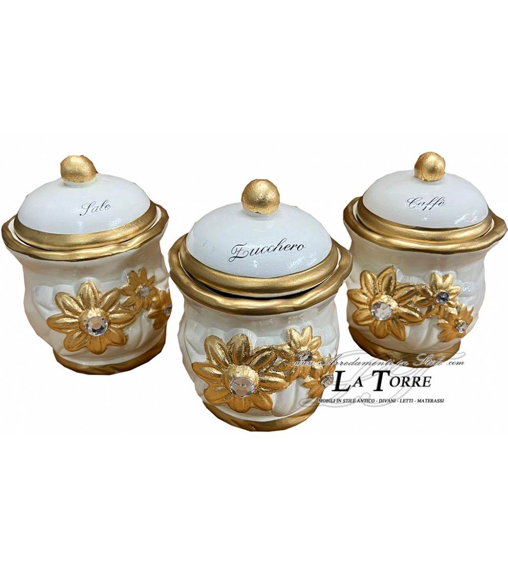 Tris set 3 pezzi barattoli in ceramica linea girasole bianco e oro sale zucchero caffè PR43