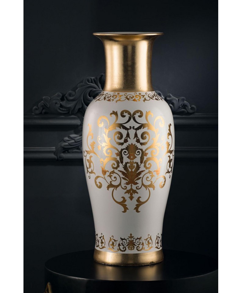 Ceramica coppa anfora dipinta a mano decorativa in ceramica, dal design raffinato ed elegante. Si distingue per il suo corpo slanciato di colore avorio, arricchito da un sontuoso decoro in oro a motivi voluta, che evoca uno stile classico e opulento. La parte superiore del vaso presenta un collo svasato con un bordo superiore dorato, impreziosito da ulteriori ornamenti in oro. La base è costituita da un piedistallo lavorato, che combina sezioni avorio e dorate, conferendo stabilità ed eleganza.