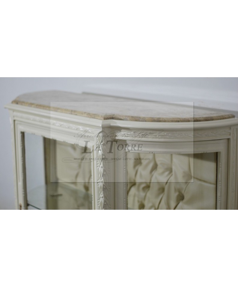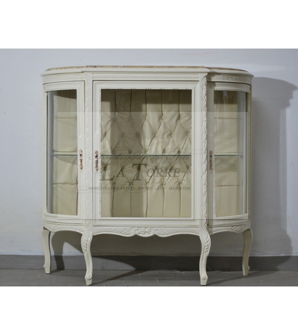 Vetrina Luigi XV caratterizzata da un design sinuoso e finiture raffinate. La struttura del mobile è realizzata in legno, laccata in un delicato colore avorio , che conferisce un aspetto luminoso e sofisticato. Le linee sono morbide e arrotondate, con fianchi curvi che le danno un'estetica armoniosa. Il piano superiore è in marmo chiaro o con una finitura effetto marmo, con venature delicate che aggiungono un tocco di pregio e praticità. La parte superiore del mobile è dominata da tre ante con vetro trasparente: un'anta centrale più ampia e due ante laterali curve, che permettono di esporre gli oggetti al suo interno. Le cornici delle ante sono laccate e presentano piccoli intagli discreti sui profili. L'interno della vetrina è particolarmente curato, con uno sfondo imbottito con una lavorazione capitonné in ecopelle avorio, all'interno si notano anche ripiani in vetro.