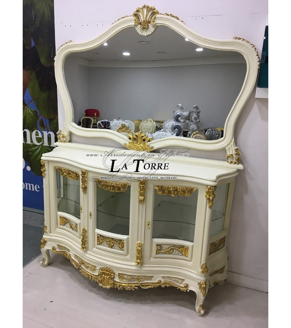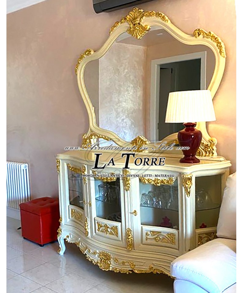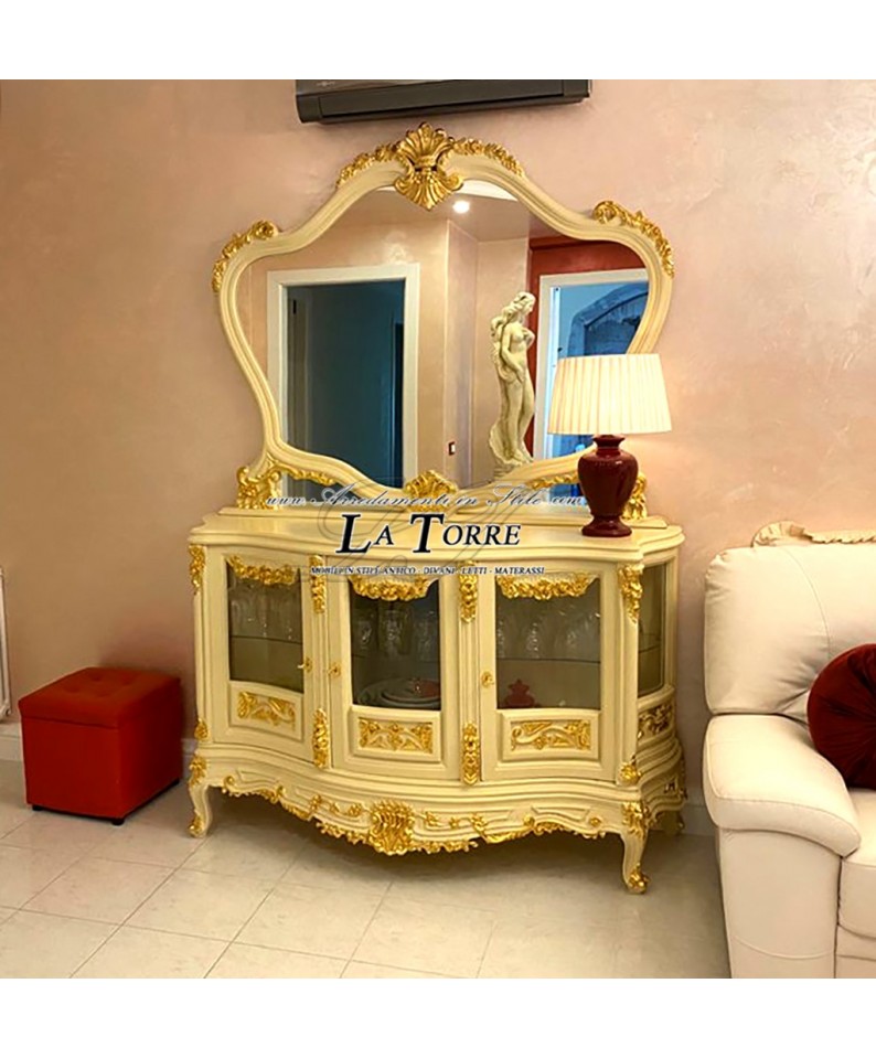 Mobile sontuoso buffet/credenza con specchiera abbinata, in stile barocco/rococò. La struttura è laccata avorio con ricchi particolari in foglia oro che decorano le tre ante vetrate curve e l'imponente cornice dello specchio. I ripiani interni sono in vetro e la base poggia su gambe curve. Un pezzo di lusso e grande impatto.